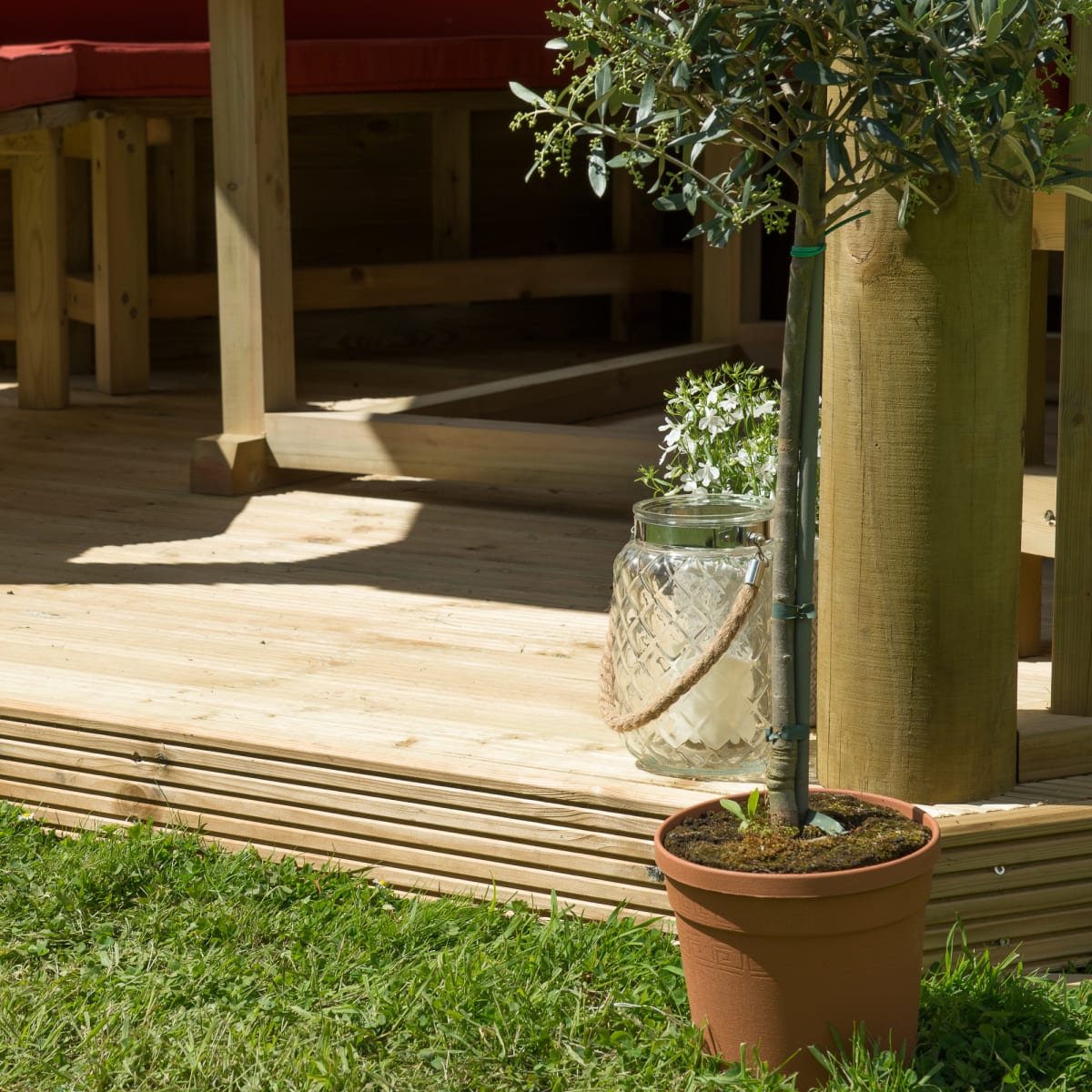This Gazebo comes with just the decked base so you can furnish to your taste. A furnished version is also available which includes a custom made table, wooden bench seats and cushions which can seat up to 10 adults or 12 children. Side curtains made from quality outdoor canvas (available in a choice of 3 colours; green, terracotta or cream) are also available as an optional extra.