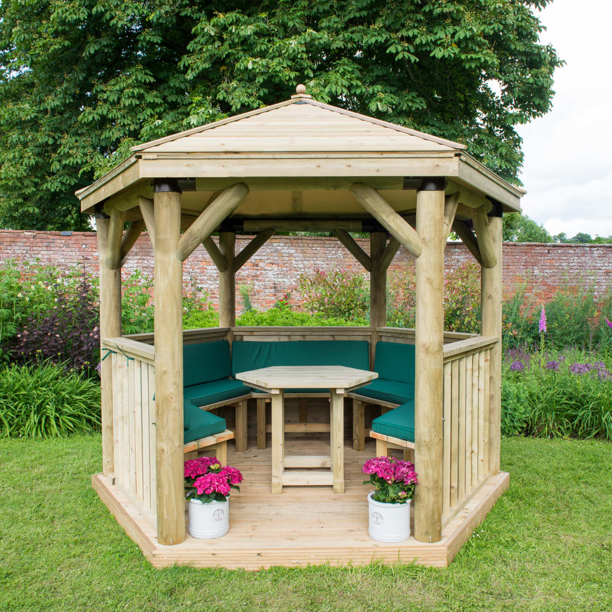 - The 3m Furnished Hexagonal Wooden Garden Gazebo with Timber Roof is a compact but striking garden feature