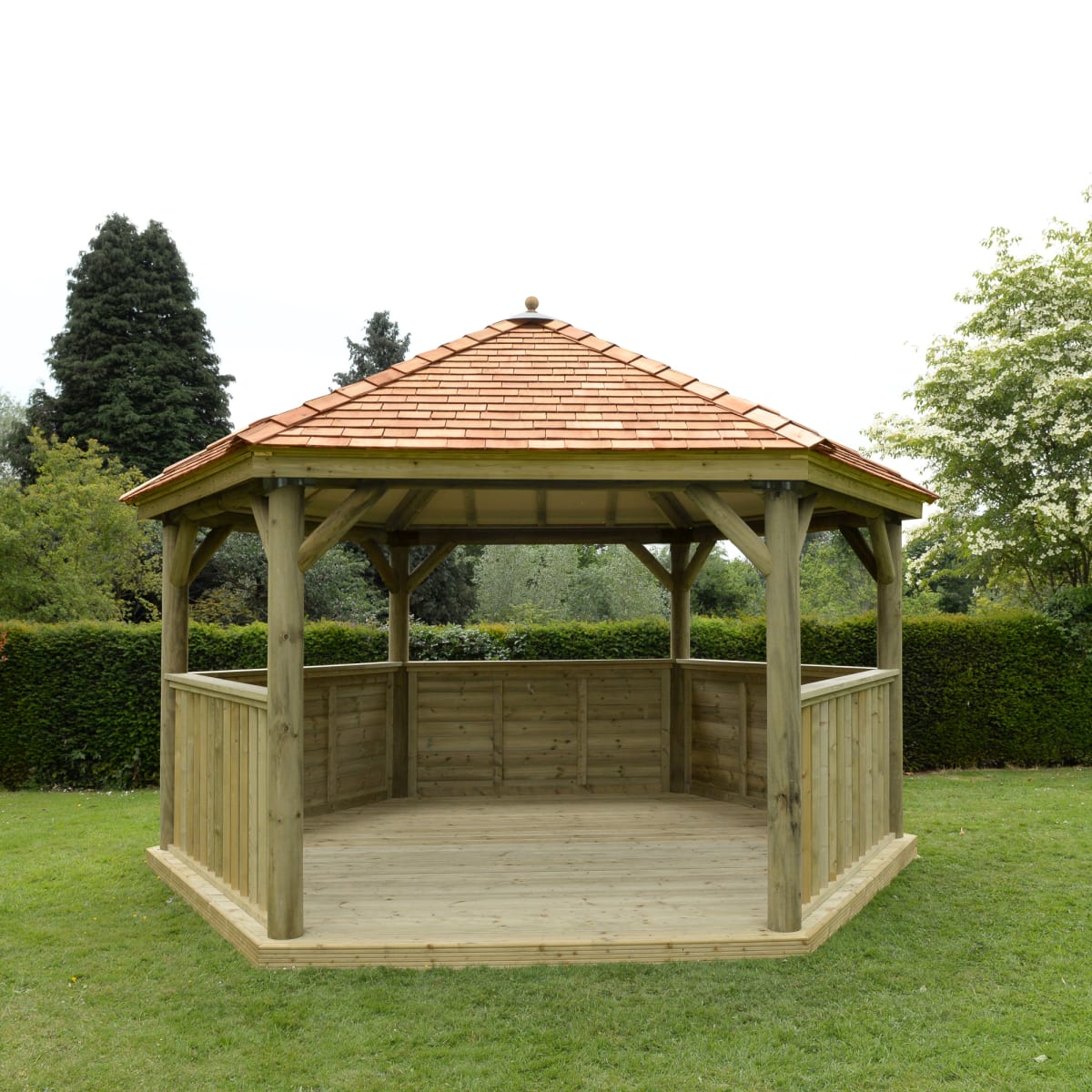 - The 4.7m Hexagonal Wooden Garden Gazebo with Cedar Roof is perfect as an extra garden room and makes a stunning centrepiece for parties and events