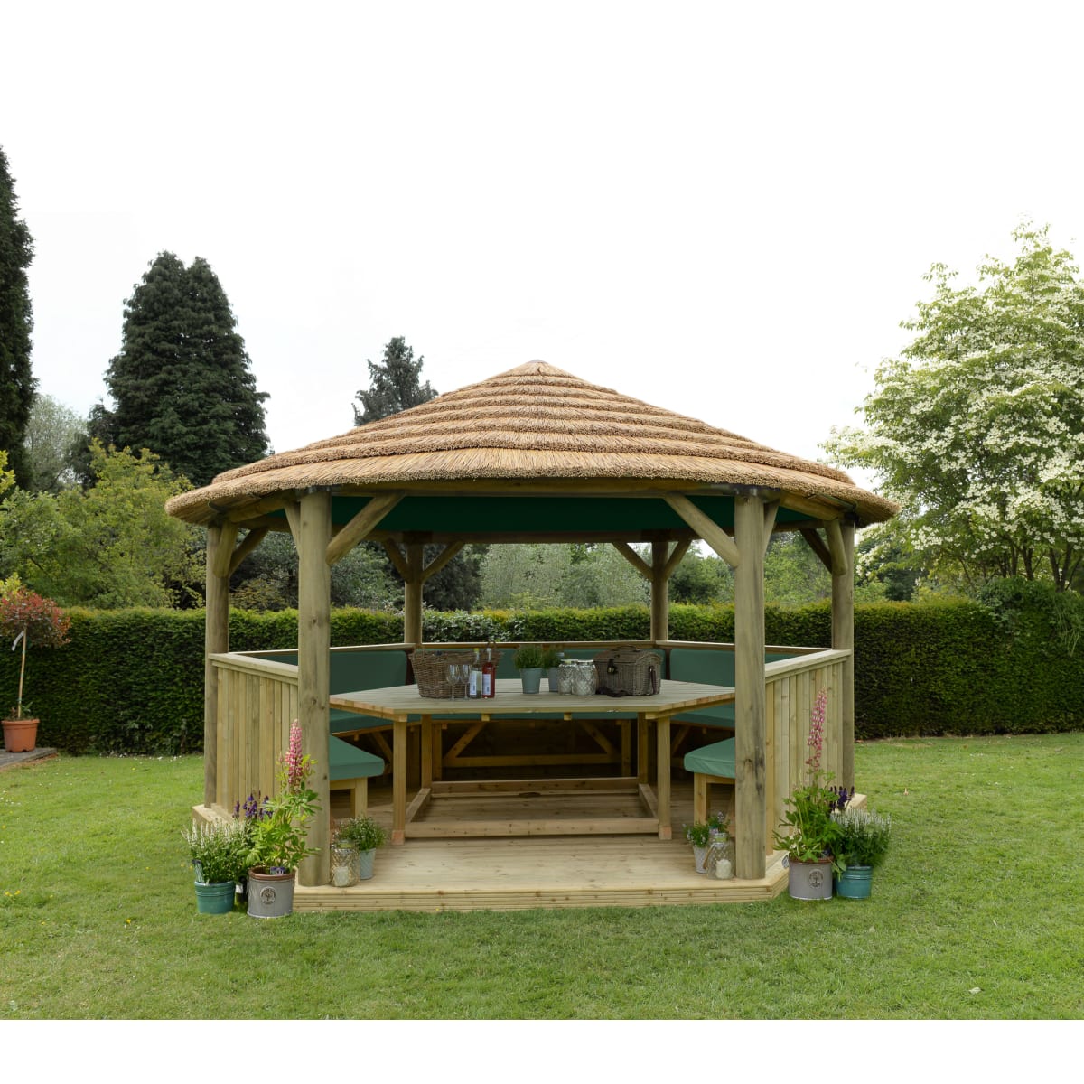 | Product Name | Forest Hexagonal Wooden Garden Gazebo With Thatched Roof Furnished 4.7m Green - Installed |
