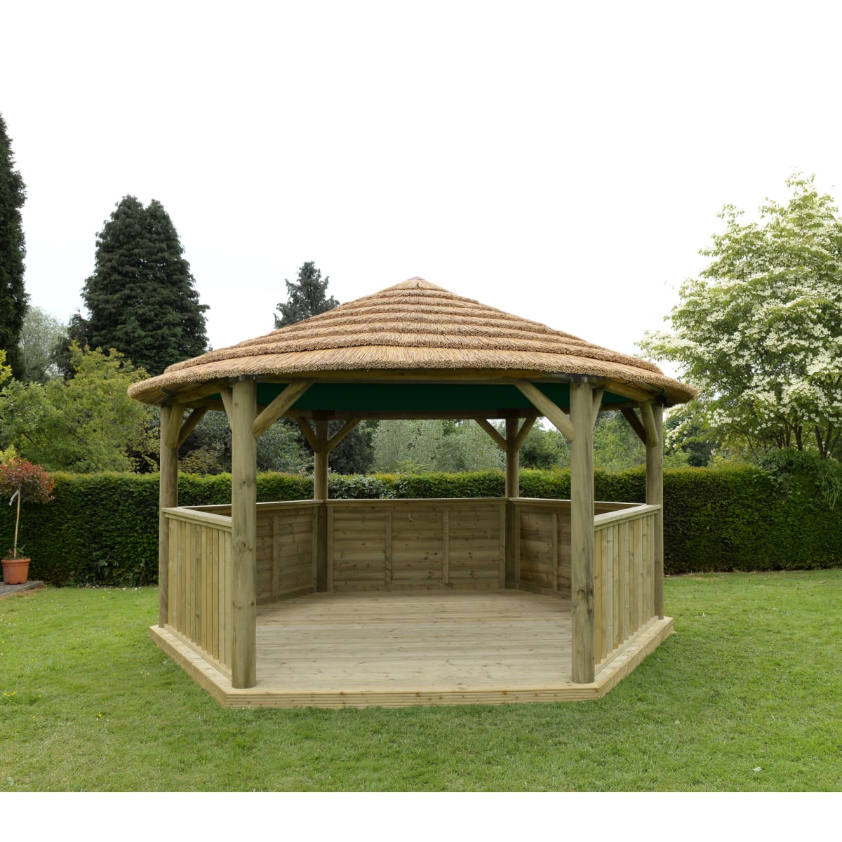 - The 4.7m Hexagonal Wooden Garden Gazebo with Thatched Roof is perfect as an extra garden room and makes a stunning centrepiece for parties and events
