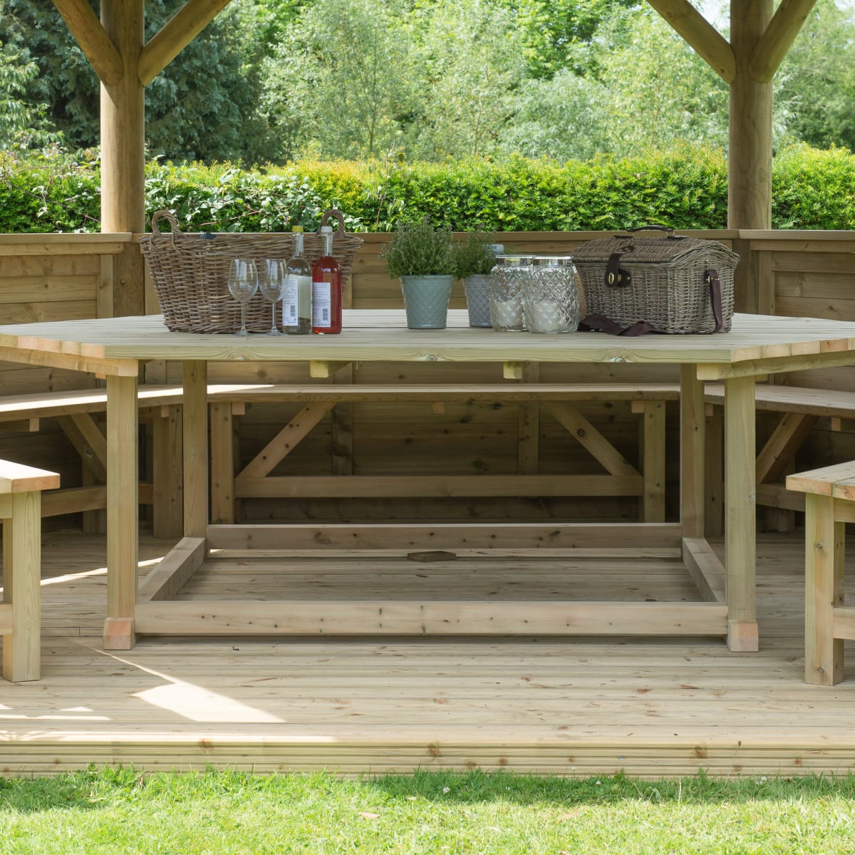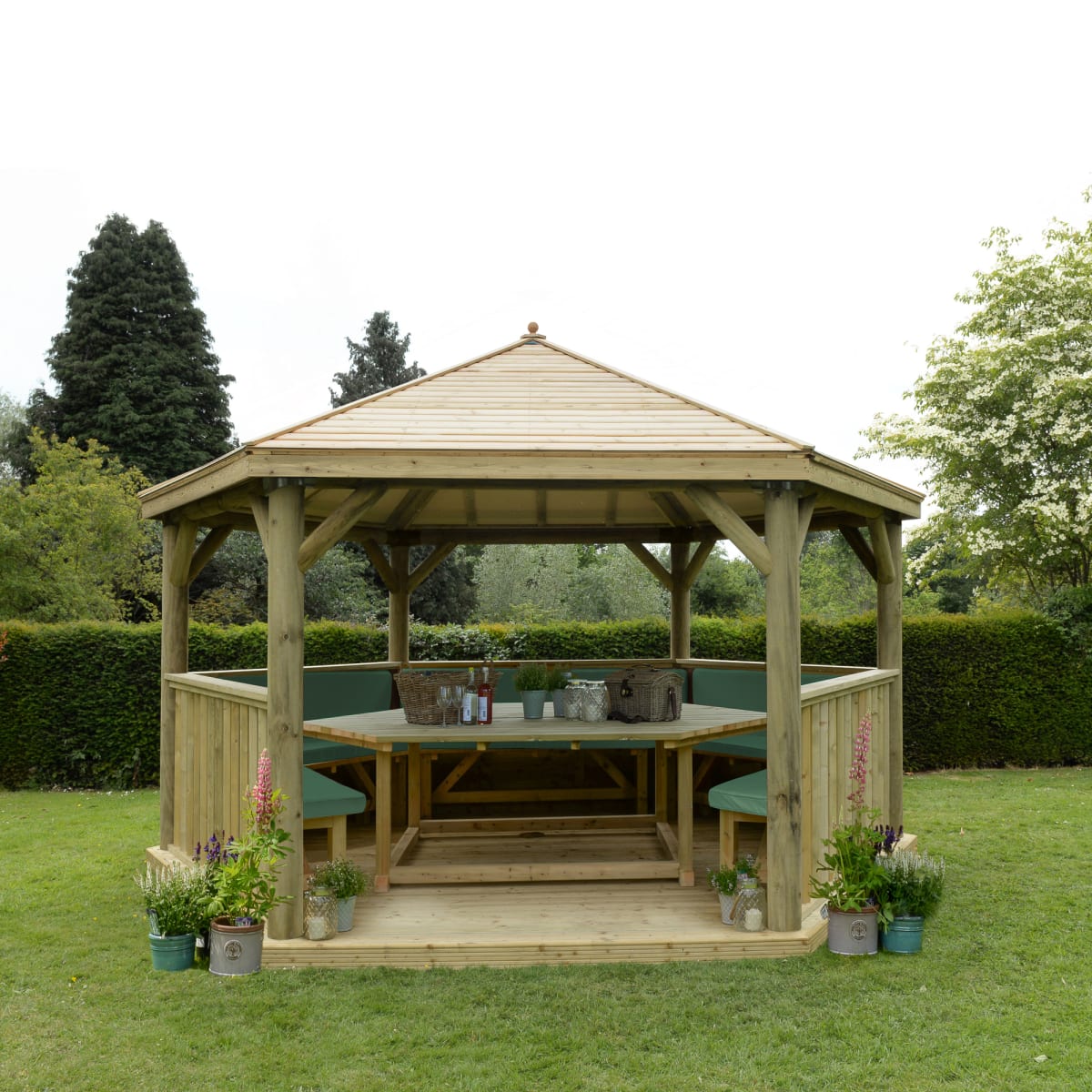 - The 4.7m Furnished Hexagonal Wooden Garden Gazebo with Timber Roof is perfect for outdoor dining