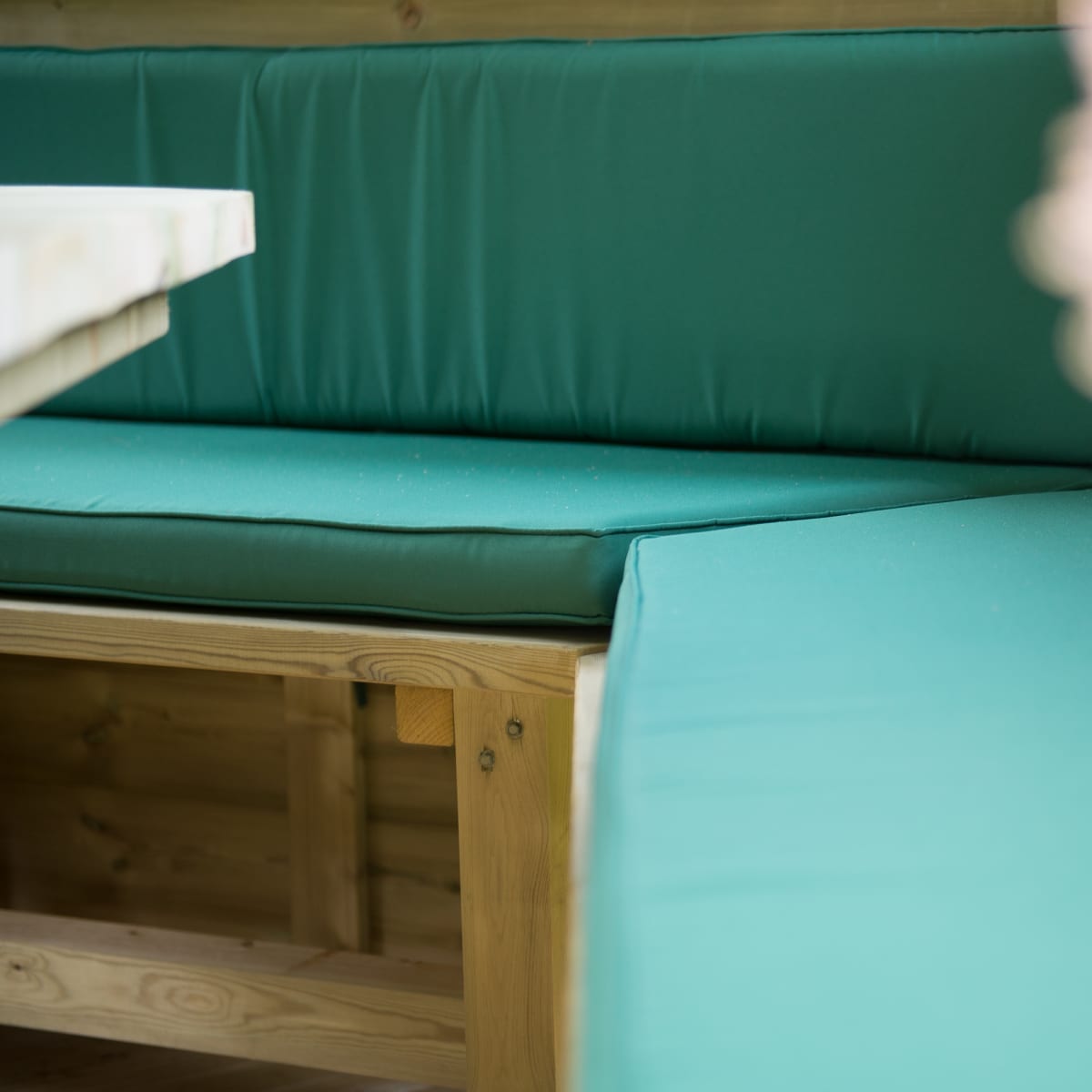 The 5 bench seats will seat up to 19 adults or 24 children and the extended hexagonal table is perfect for dining or drinks. Made from quality green outdoor canvas, the comfortable 3-inch deep cushion set is custom made to fit the corner style benches and, for added comfort, includes separate back cushions. For added protection from the sun or a light shower, matching green roll-down curtains in a set of 6 are available to purchase separately.