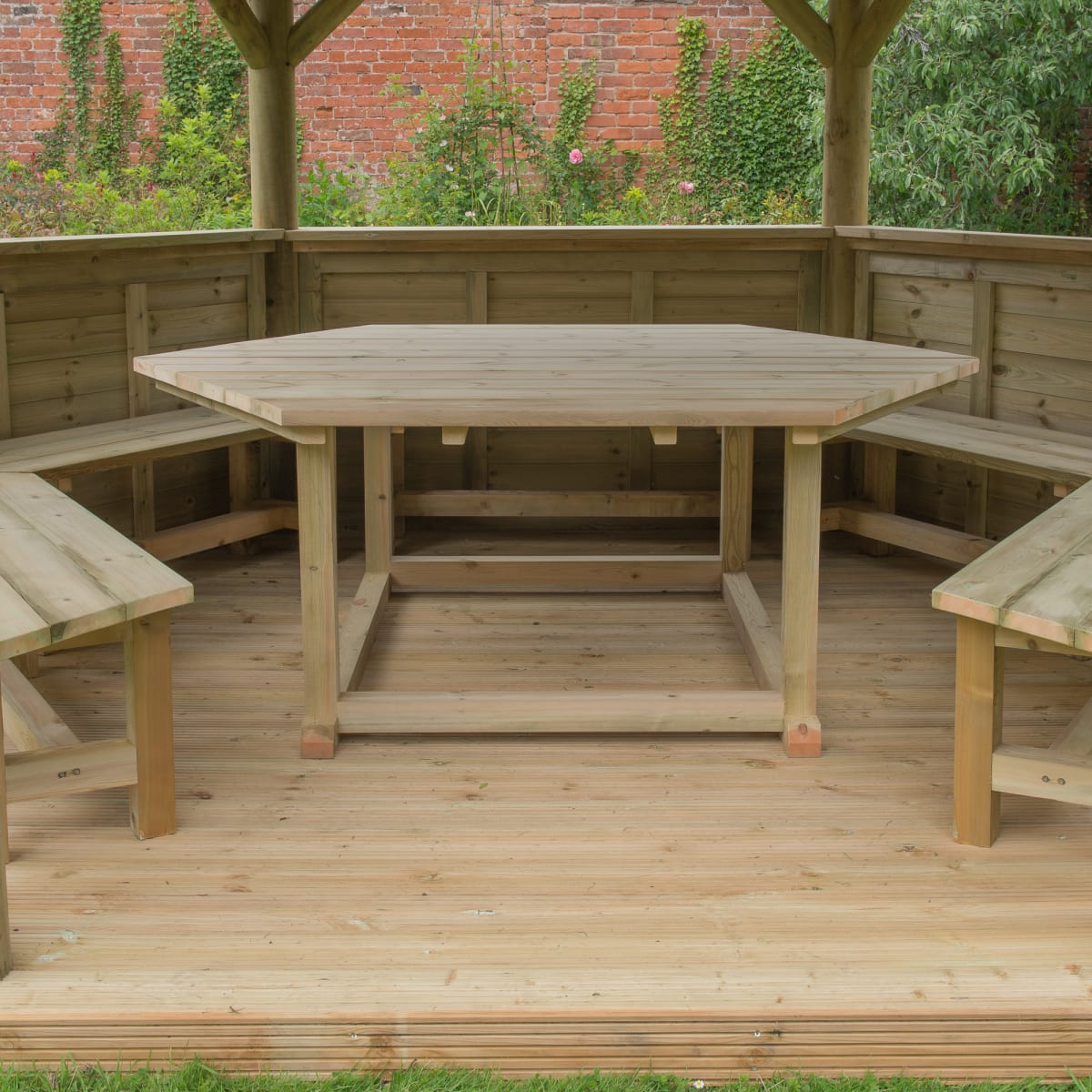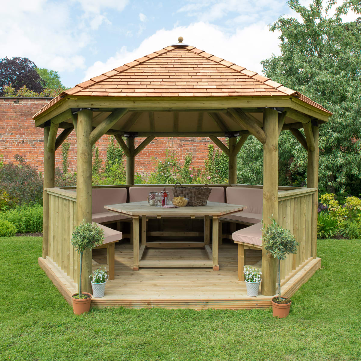 - The 4m Furnished Hexagonal Wooden Garden Gazebo with Cedar Roof is perfect for outdoor dining