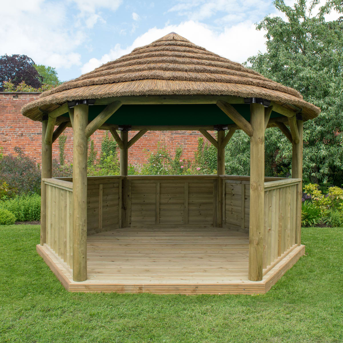 - The 4m Hexagonal Wooden Garden Gazebo with Thatched Roof is perfect for a larger outdoor dining area.