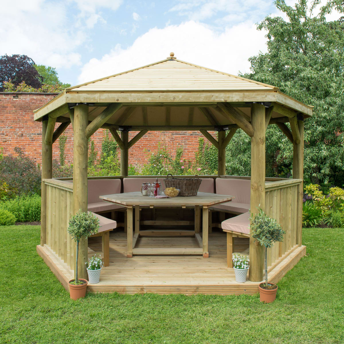- The 4m Furnished Hexagonal Wooden Garden Gazebo with Timber Roof is perfect for outdoor dining