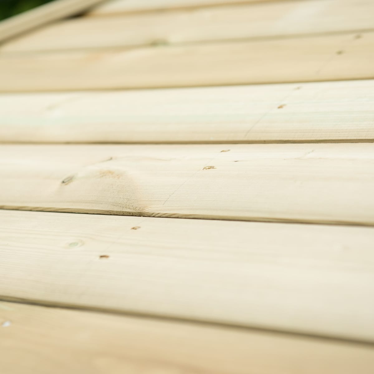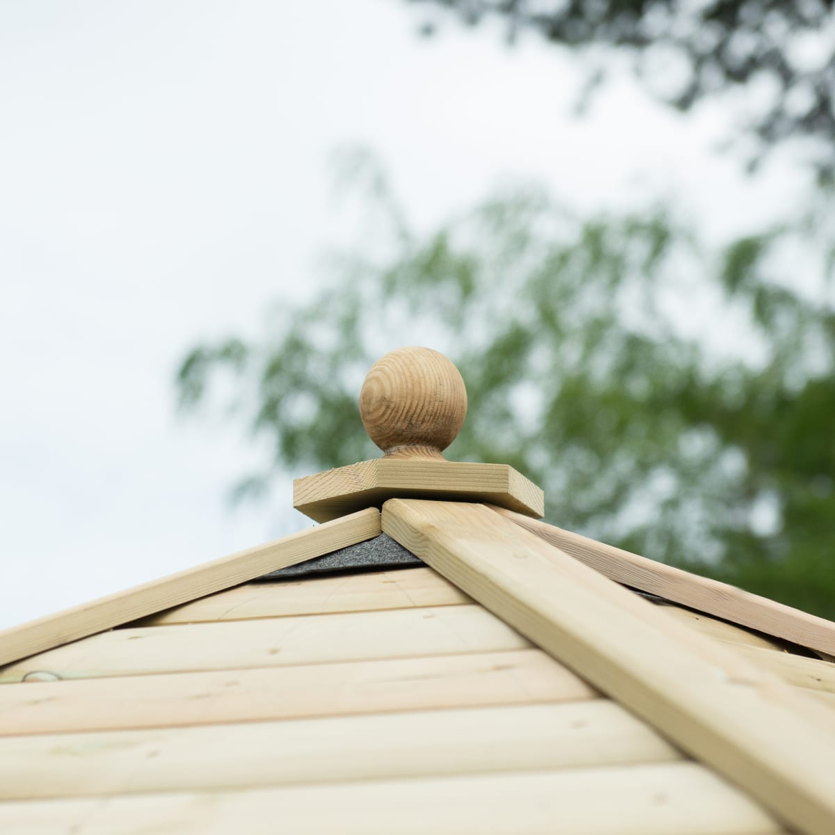 Pressure treated softwood is formed into a Log Lap roof structure and placed on top of a water-proof Tricoya lining, giving the Gazebo a simple, elegant and cost-effective finish.