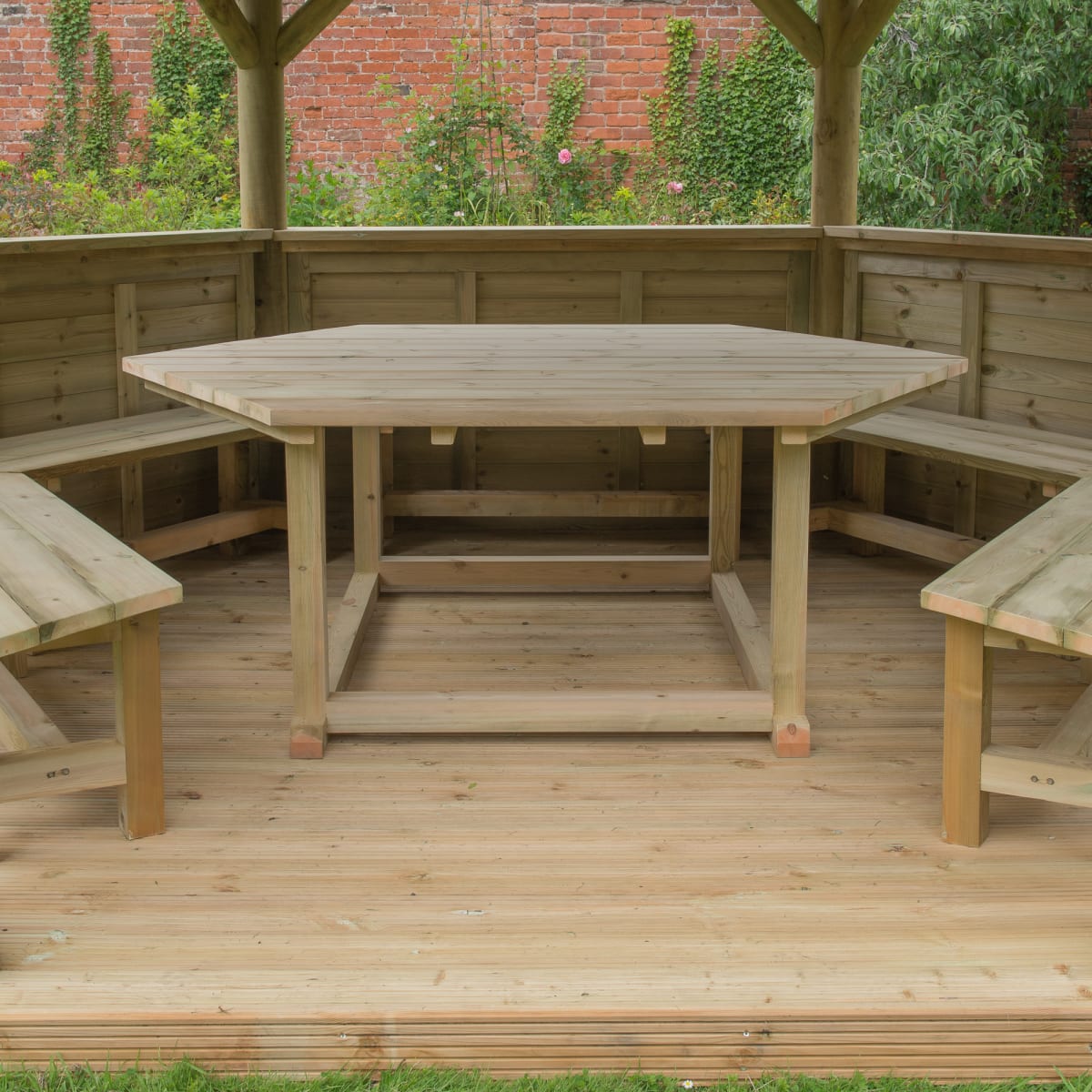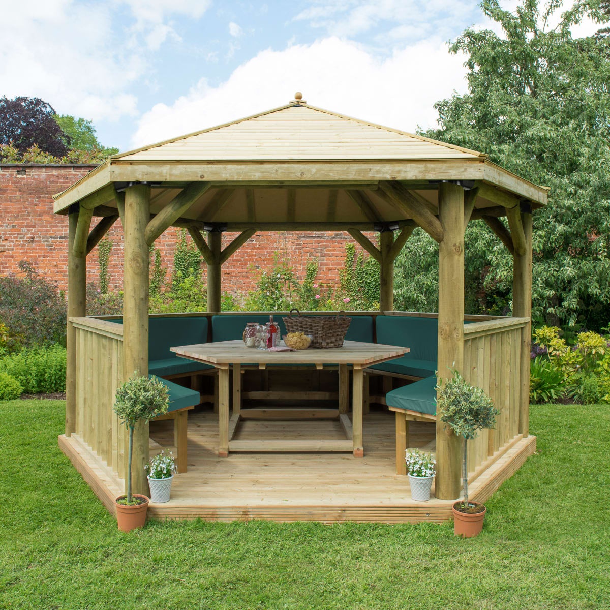 - The 4m Furnished Hexagonal Wooden Garden Gazebo with Timber Roof is perfect for outdoor dining