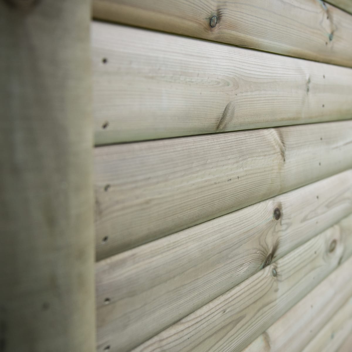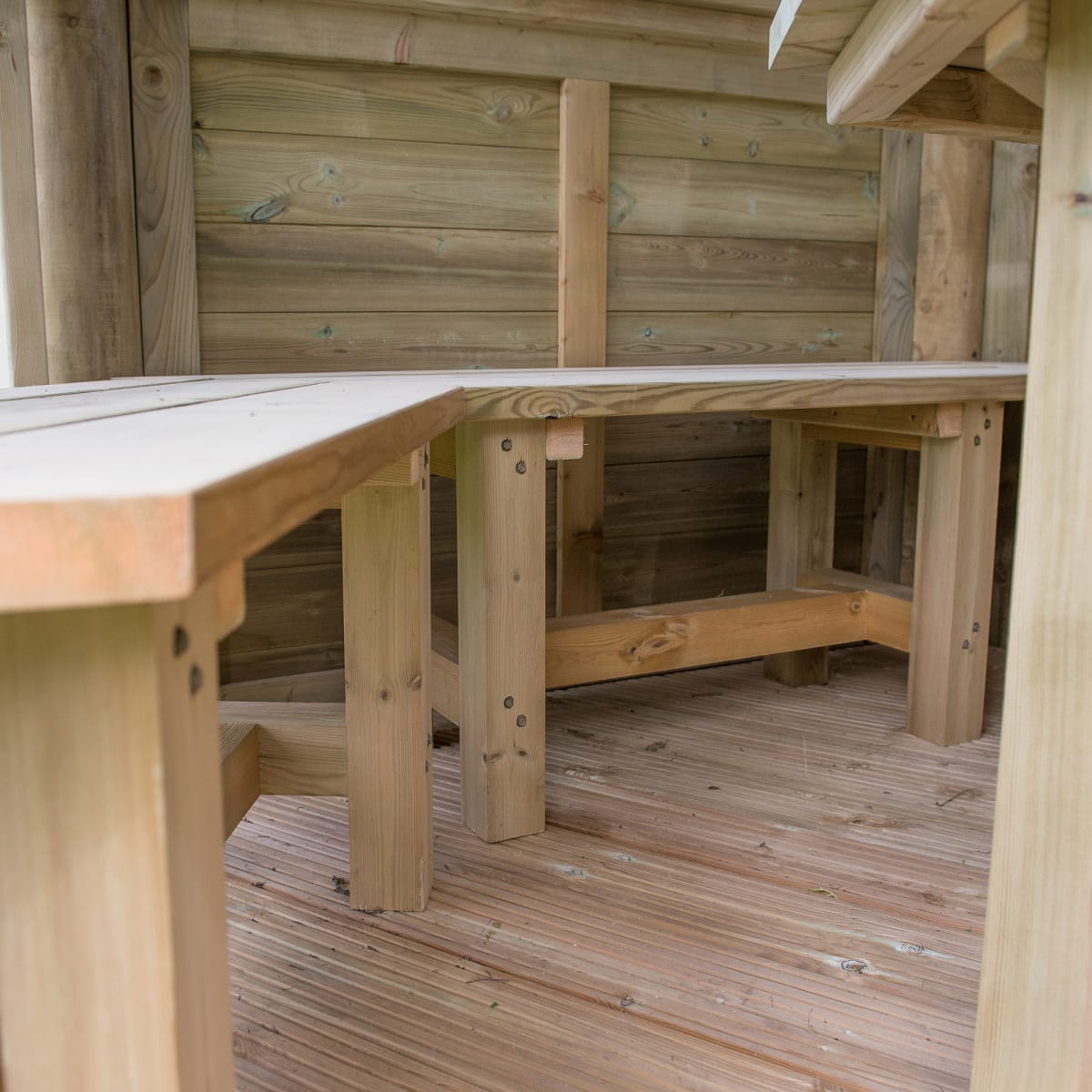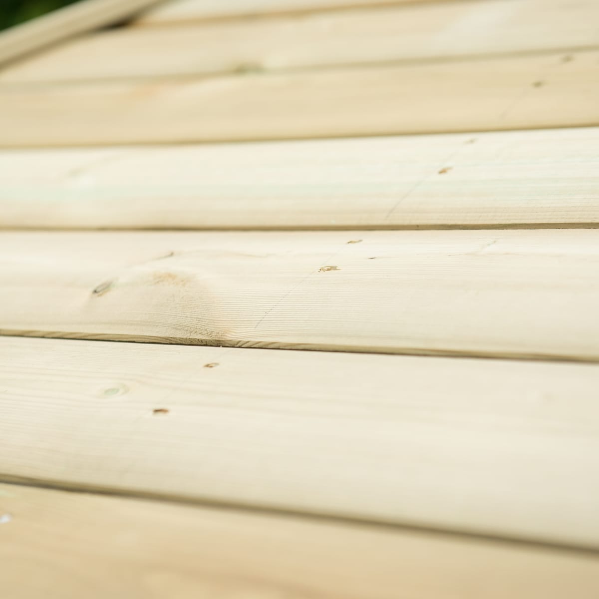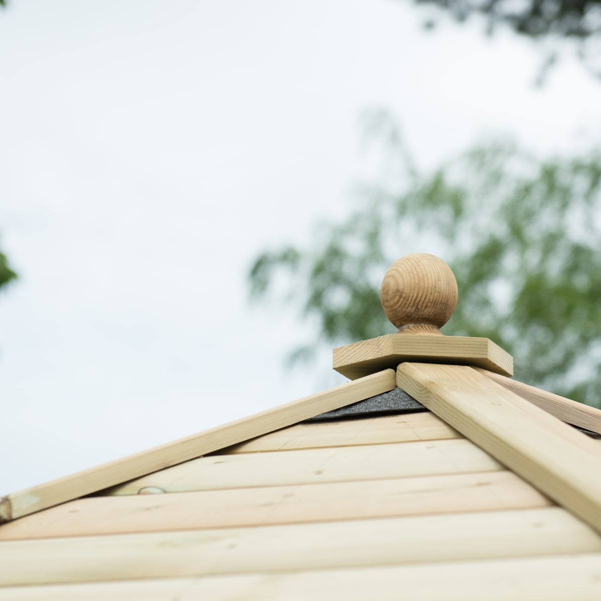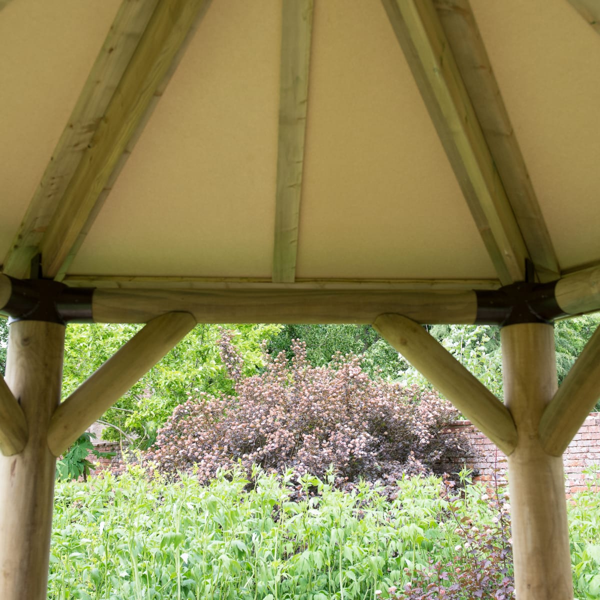 Pressure treated softwood is formed into a Log Lap roof structure and placed on top of a water-proof Tricoya lining, giving the Gazebo a simple, elegant and cost-effective finish.