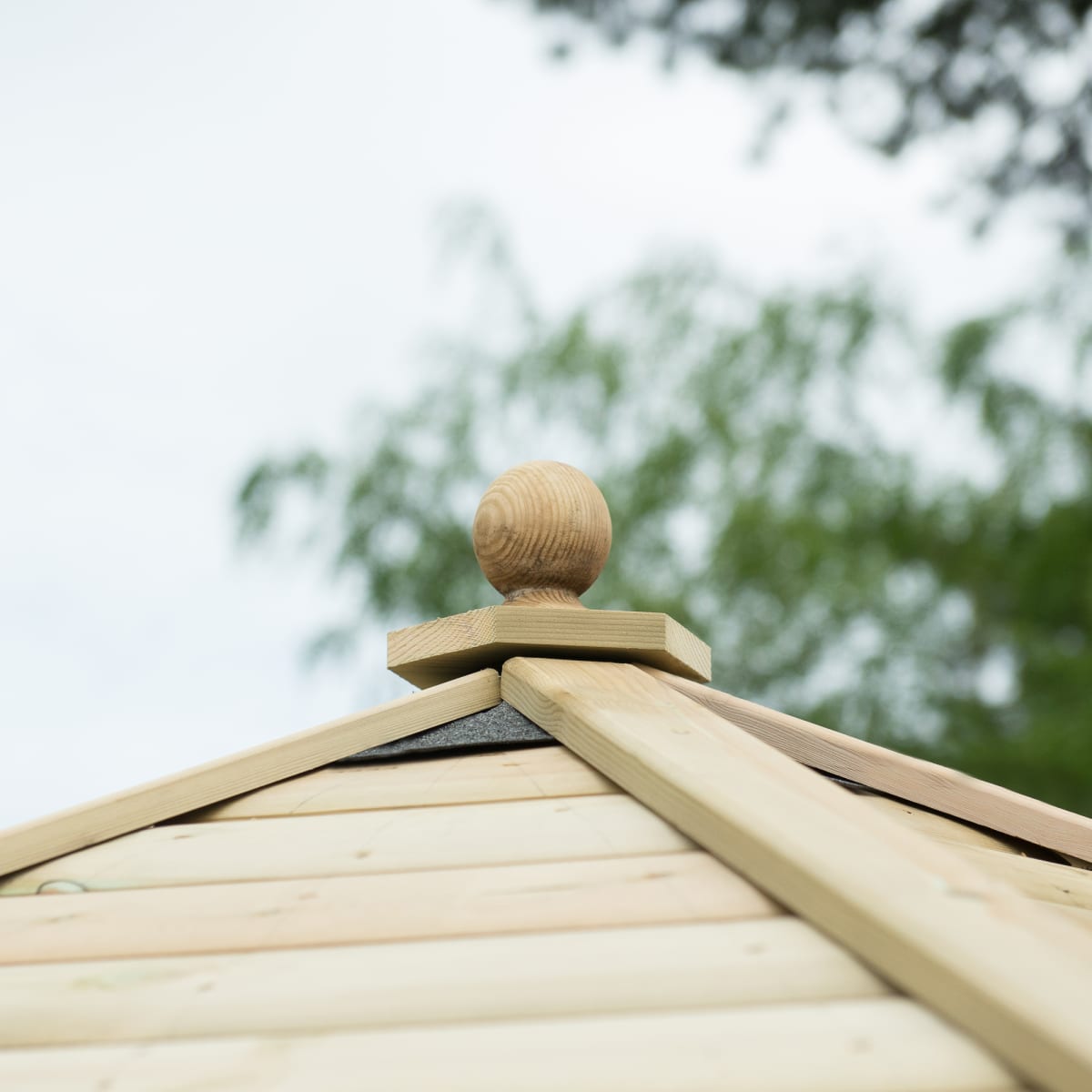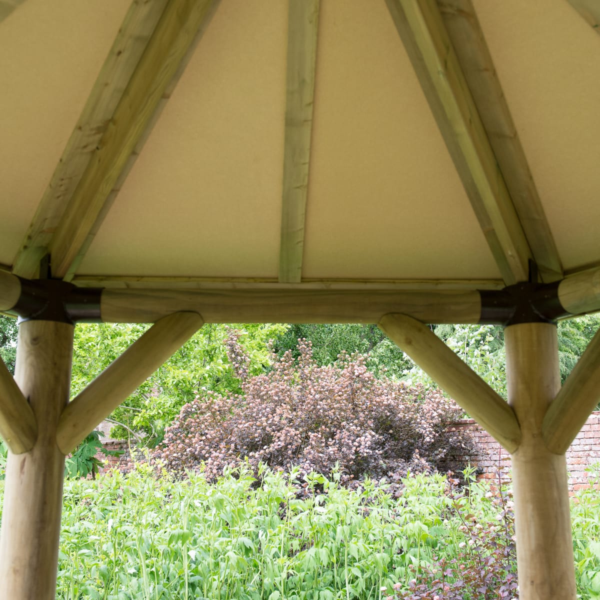 Pressure treated softwood is formed into a Log Lap roof structure and placed on top of a water-proof Tricoya lining, giving the Gazebo a simple, elegant and cost-effective finish. The substantial uprights are secured to the base that features profiled deck boards, while at the top steel brackets secure them to the perimeter frame, giving the Gazebo immense strength and rigidity.