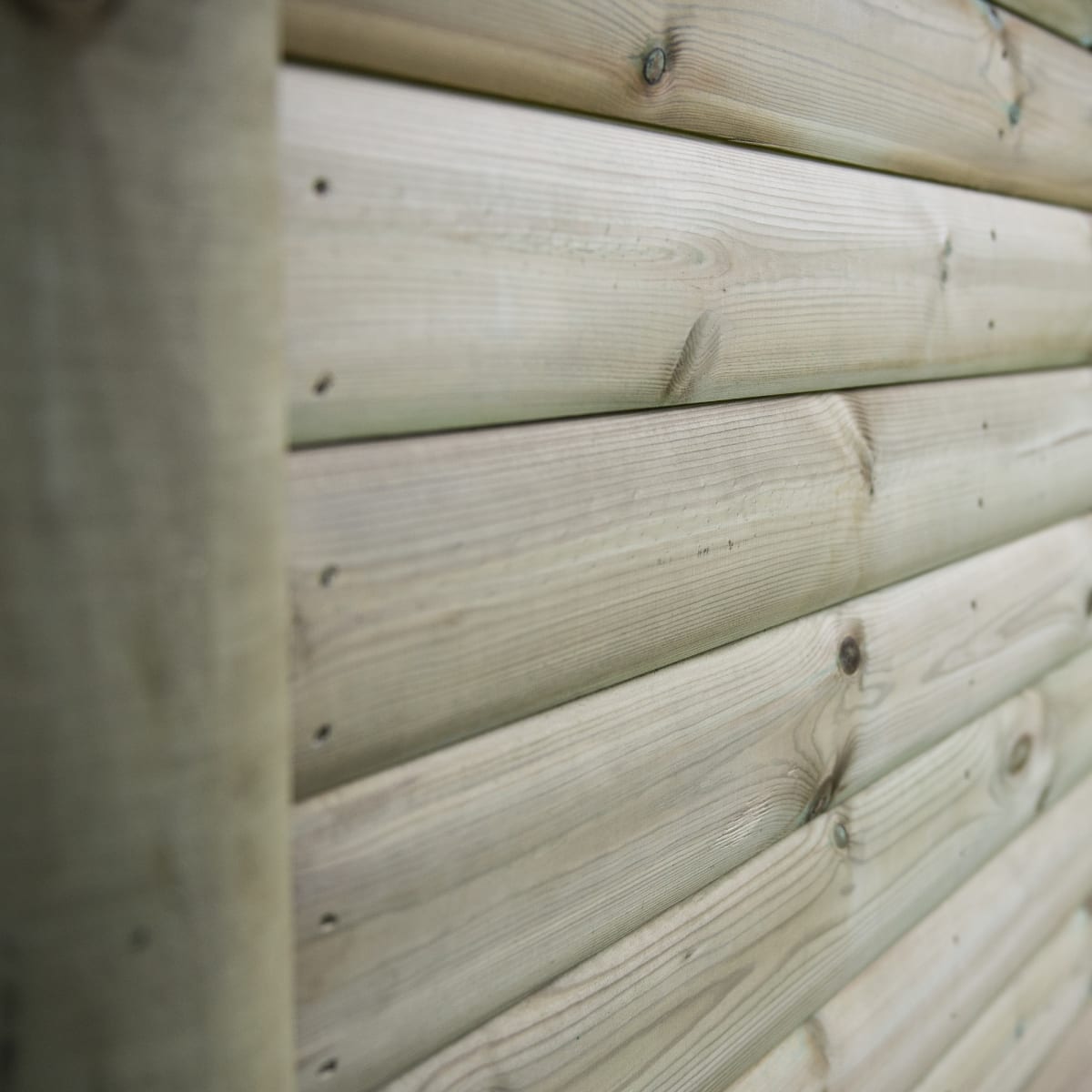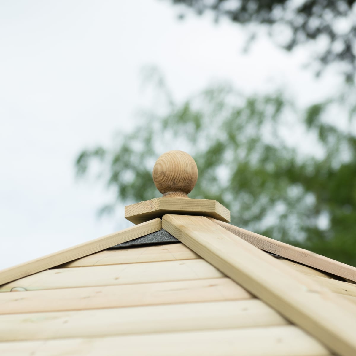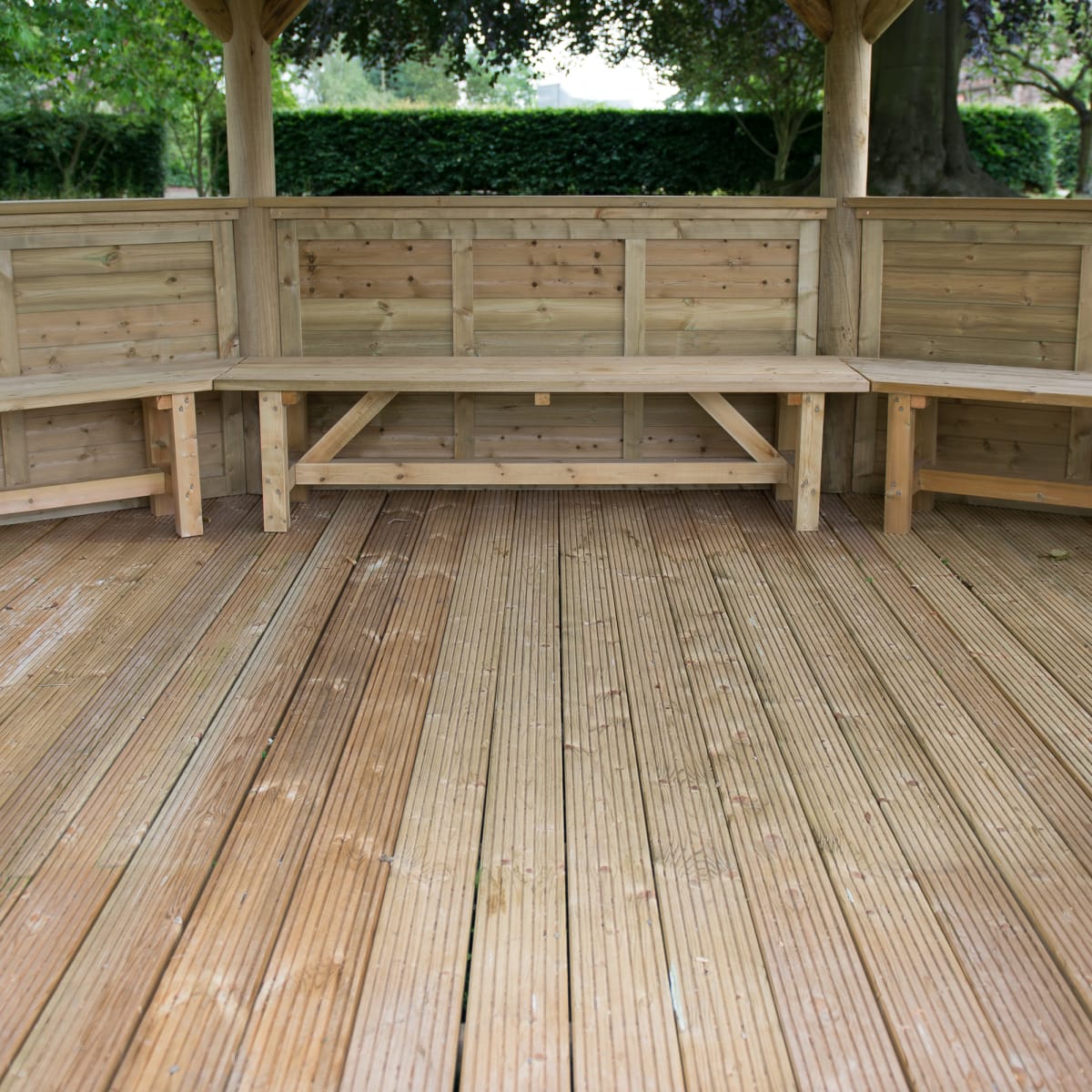 Pressure treated softwood is formed into a Log Lap roof structure and placed on top of a water-proof Tricoya lining, giving the Gazebo a simple, elegant and cost-effective finish. The substantial uprights are secured to the base that features profiled deck boards, while at the top steel brackets secure them to the perimeter frame, giving the Gazebo immense strength and rigidity.
