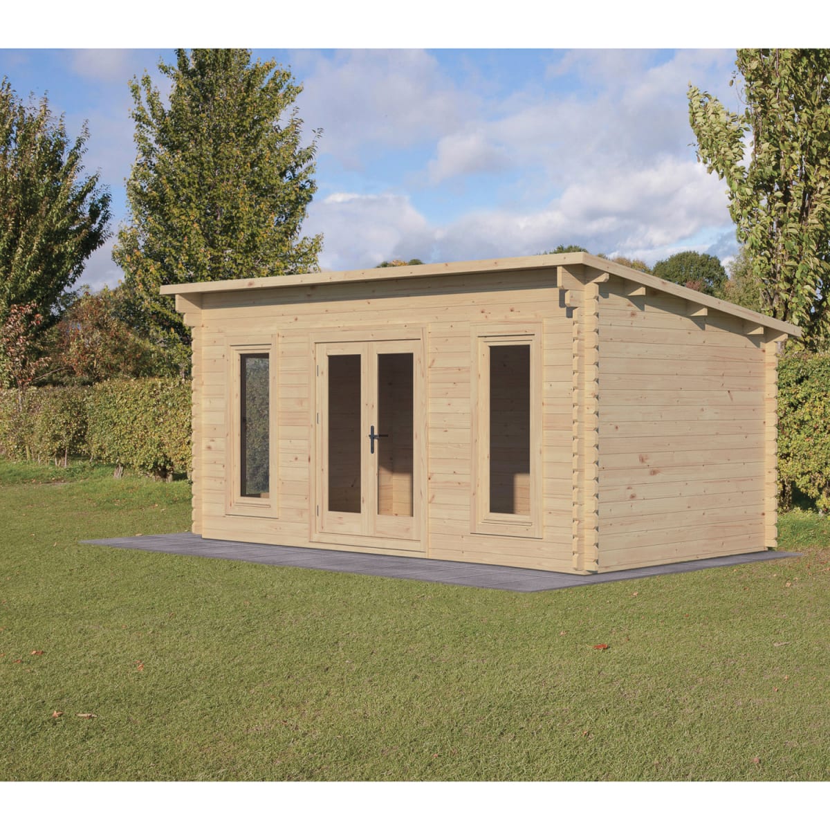 The Elmley is a mid sized Log Cabin with a 5m wide x 3m deep footprint and contemporary pent roof design. It's impressive specification includes 45mm thick interlocking log walls, 19mm tongue and groove floor and roof, double glazed double doors, two tilt and turn double glazed windows to the front and a 3/4 length double glazed tilt and turn side window that can be positioned in the left or right wall.