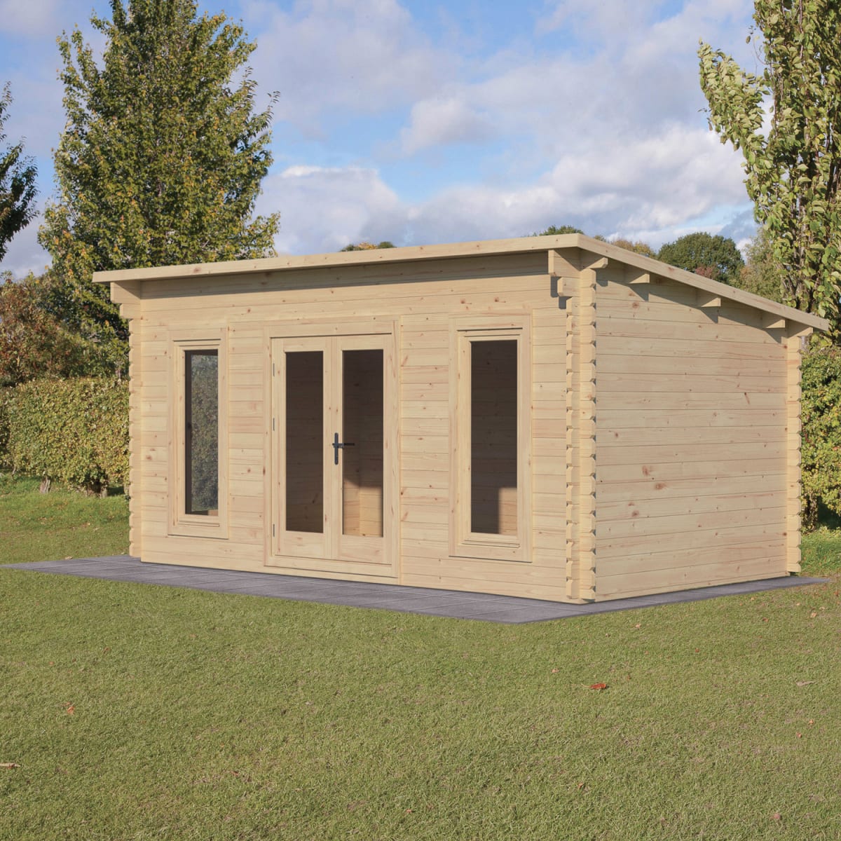 The Elmley is a mid sized Log Cabin with a 5m wide x 3m deep footprint and contemporary pent roof design. It's impressive specification includes 45mm thick interlocking log walls, 19mm tongue and groove floor and roof, double glazed double doors, two tilt and turn double glazed windows to the front and a 3/4 length double glazed tilt and turn side window that can be positioned in the left or right wall.