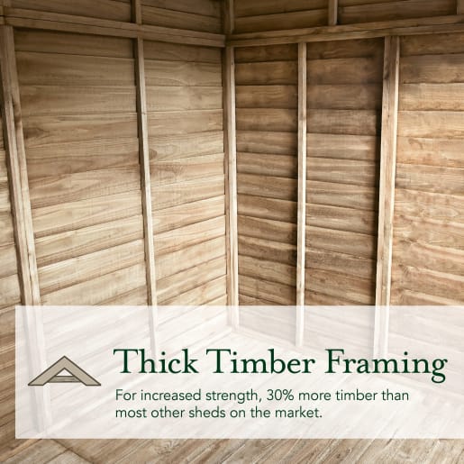 All in all, the Forest 4Life range of sheds are the best overlap sheds we've ever made. Supported by 30%-thicker framing than found on most wooden sheds, this shed is constructed using straight-cut 7mm boards that overlap to give flexibility, allowing natural movement of the timber during the changing seasons and aiding rain water run-off.