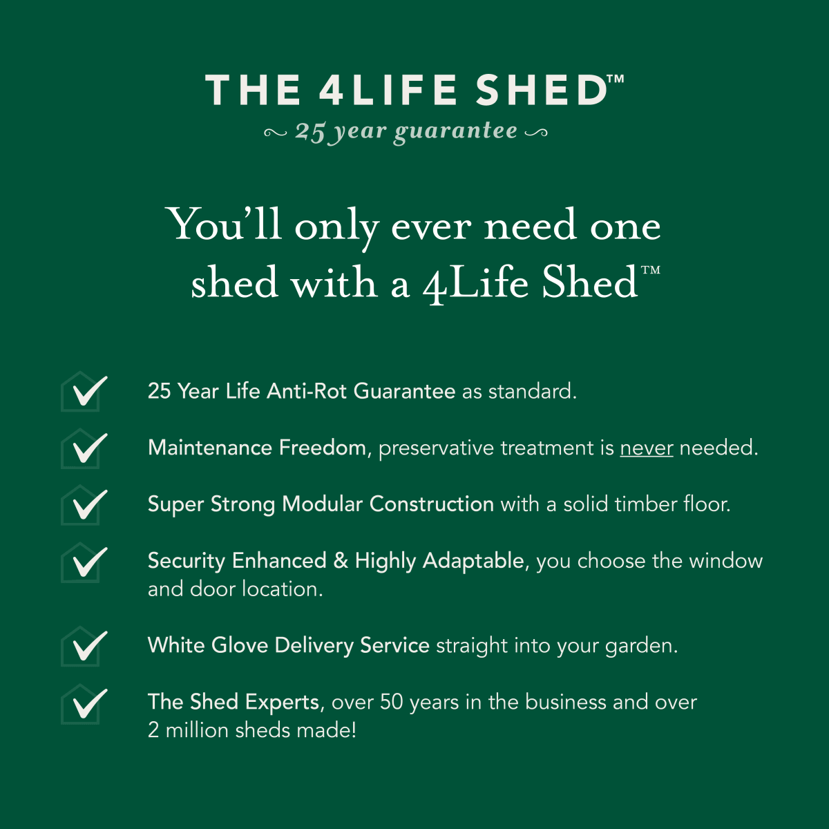 The pressure treatment that has been applied gives this shed a 25-year anti-rot guarantee, giving you maintenance freedom, preservative treatment is NEVER needed! You'll only ever need one shed with a 4Life Shed!