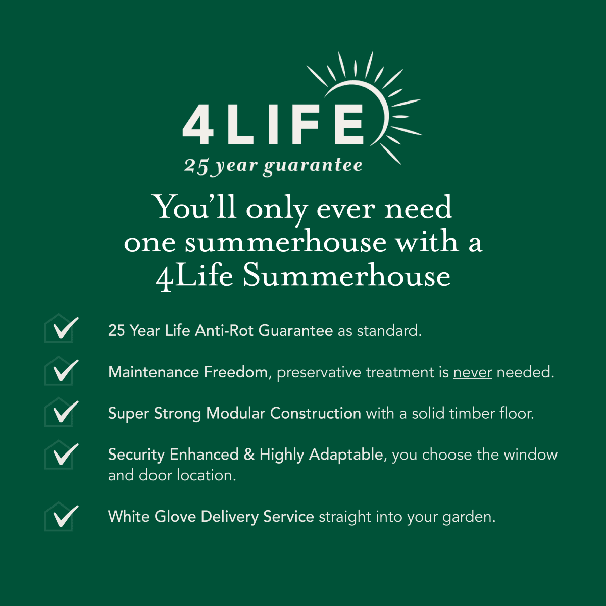All in all, the Forest 4Life range of summerhouses are the best overlap summerhouses we've ever made. The pressure treatment that has been applied gives this summerhouse a 25-year anti-rot guarantee as standard, giving you maintenance freedom, preservative treatment is NEVER needed! You'll only ever need one summerhouse with a 4Life summerhouse! Rather than the more common OSB (oriented strand board), this summerhouse features solid timber floor, allowing for the storage of heavier items. The roof of this pent summerhouse is made from hardwearing 8mm solid sheet, finished with a green sand-felt cover for complete weatherproof protection.