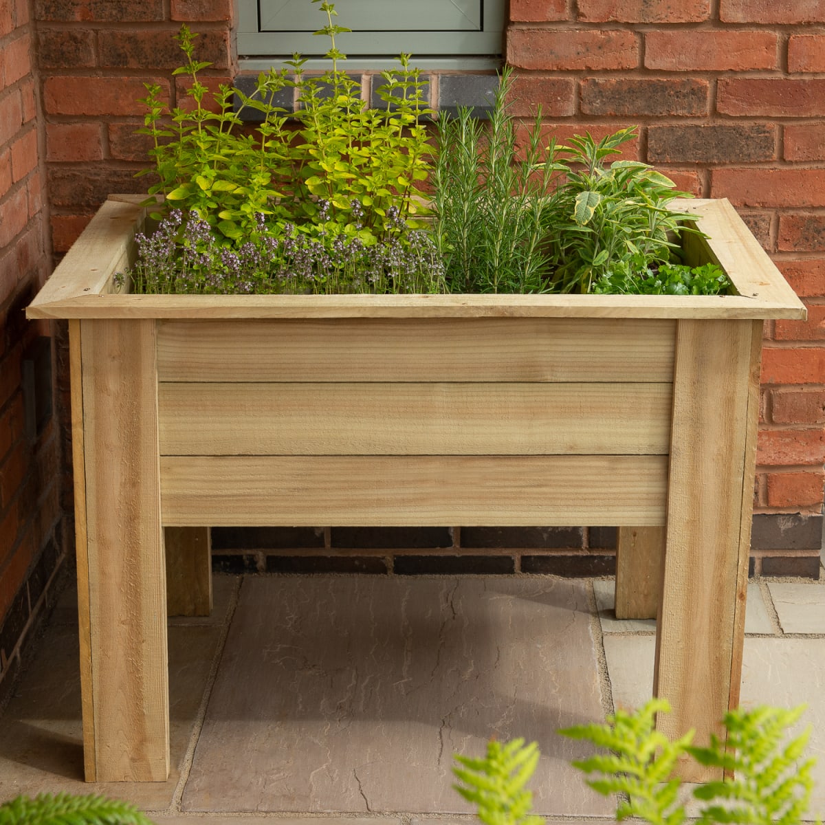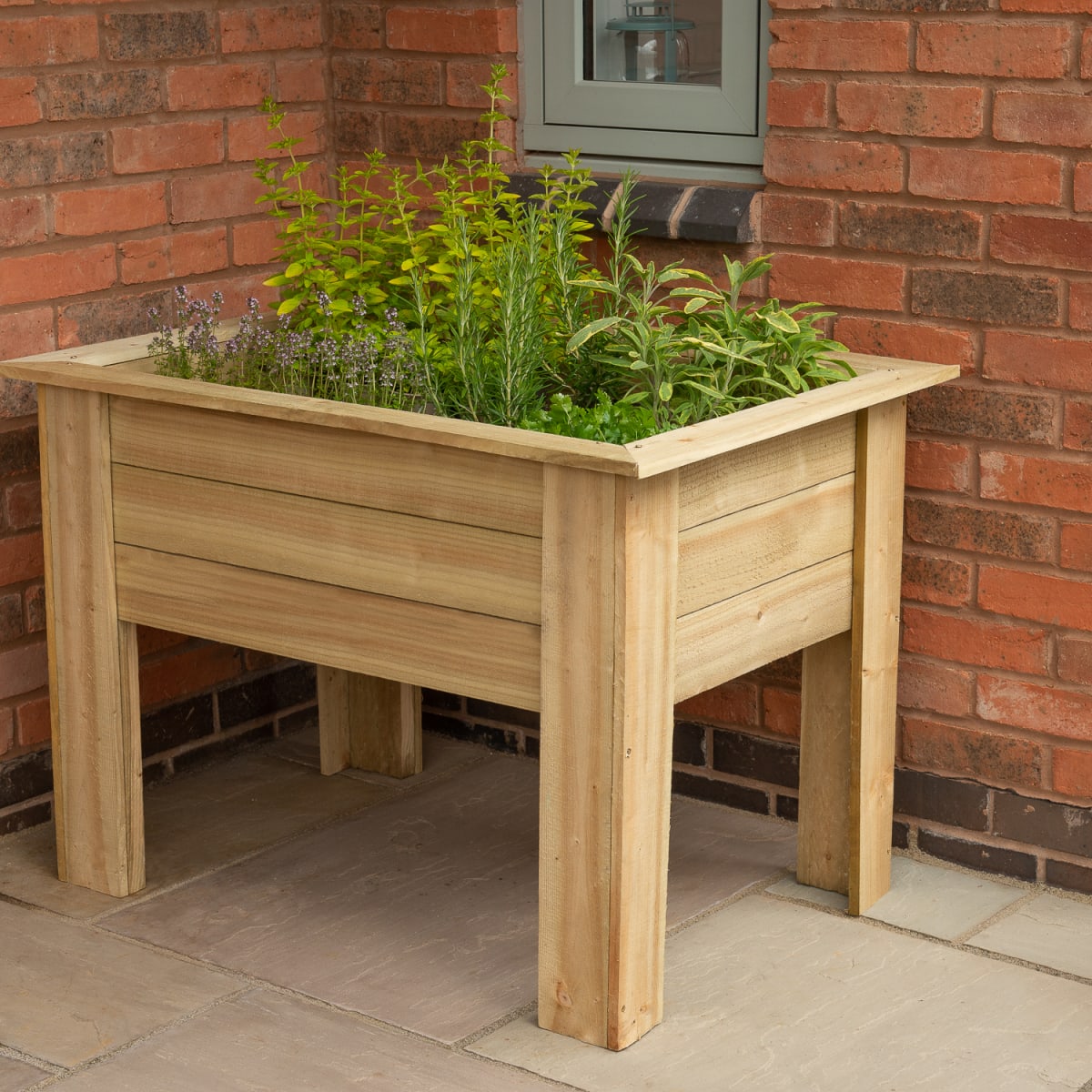 The 1m Kitchen Garden Planter from Forest Garden is designed with the perfect planting depth for growing herbs and salads. The planter's relatively compact footprint means it can be positioned conveniently near a back door or on a balcony plus the attractive design means it will look great in any garden setting.This size has an internal planting length of 850mm, width of 550mm and depth of 290mm. The planter raises the plants up to a convenient height of around 700 - 900mm making it easy to crop and tend to them. There is also plenty of room for all the herbs you are likely to need including thyme, sage, parsley and chives. Just remember to plant any mint in a pot to prevent it from spreading. The planter is also ideal for creating a display of decorative flowering plants.Supplied with instructions and screws for assembly, this Kitchen Garden Planter is very quick and easy to assemble, needing just 3 screws in each leg and 4 in each corner to secure the top surround. It is recommend lining the planter with a suitable porous membrane before filling with compost, especially if you are using to grow edible produce. Holds approximately 140 litres of compost. Manufactured in the UK from UK grown FSC® certified timber which has been pressure treated to protect against rot and has a 15 year anti-rot guarantee. If using to grow food produce it is recommend lining the bed/planter with a membrane before adding the soil.