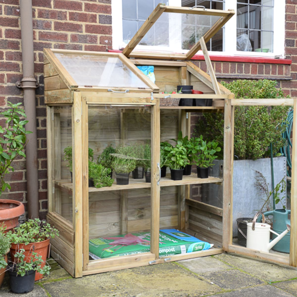 The front edge is lowered to encourage efficient rain water run-off and allow maximum light to enter the interior through the styrene glazing. The timber has been Pressure Treated to give a 15 year guarantee against rot and fungal damage.The Forest mini greenhouse has excellent flexibility, with two independently opening lids that can be propped open and double doors – you can control air flow and temperature easily and only open the sections you need to access. Inside the greenhouse there are two shelves and the base is designed to fit a standard size grow bag.Comes with full instructions for easy self-assembly.