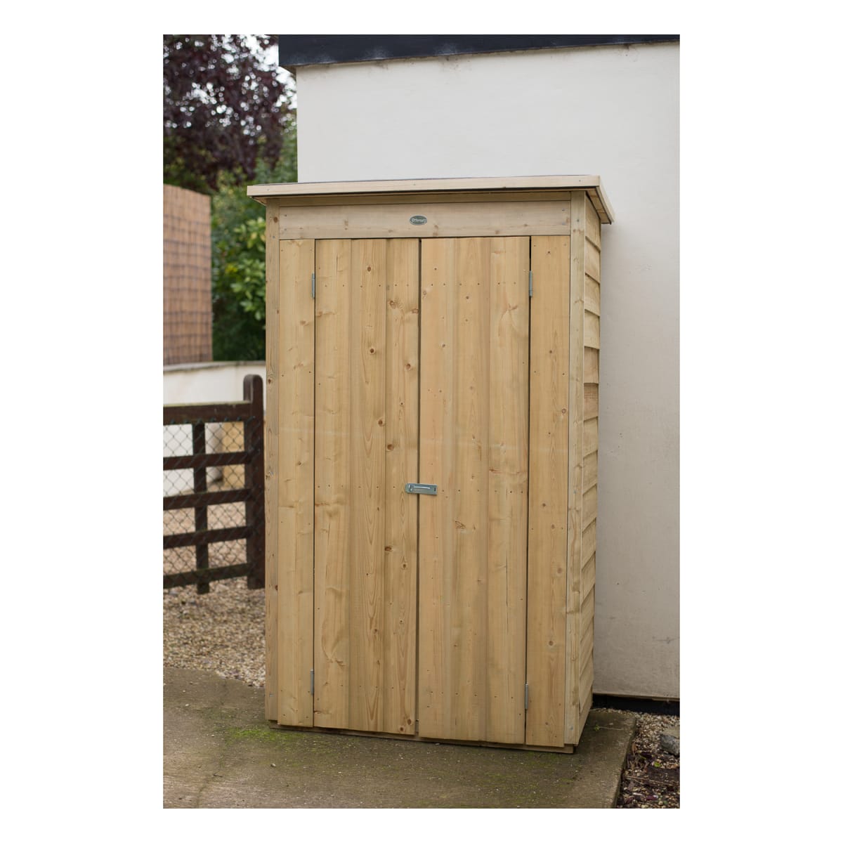 The Tall Garden Store from Forest is perfect for positioning against a wall or fence. With a roof height of just under six foot, it is ideal for storing a wide range of outdoor equipment such as long handled gardening tools, children's toys or folding furniture. The relatively small footprint and natural colour finish means it will blend attractively into any garden setting. This Tall Garden Store is manufactured from traditional Pressure Treated overlap panels and finished with smooth-planed barge boards and Shiplap Tongue & Groove panels on the front. The felted Pent roof keeps the store weathertight and can be assembled sloping backwards or forwards to suit personal preference and position. The unit is also mounted on Pressure Treated bearers to keep it off the ground and dry. The double doors can be closed using the plate hasp and staple latch which can be secured with the addition of a padlock.