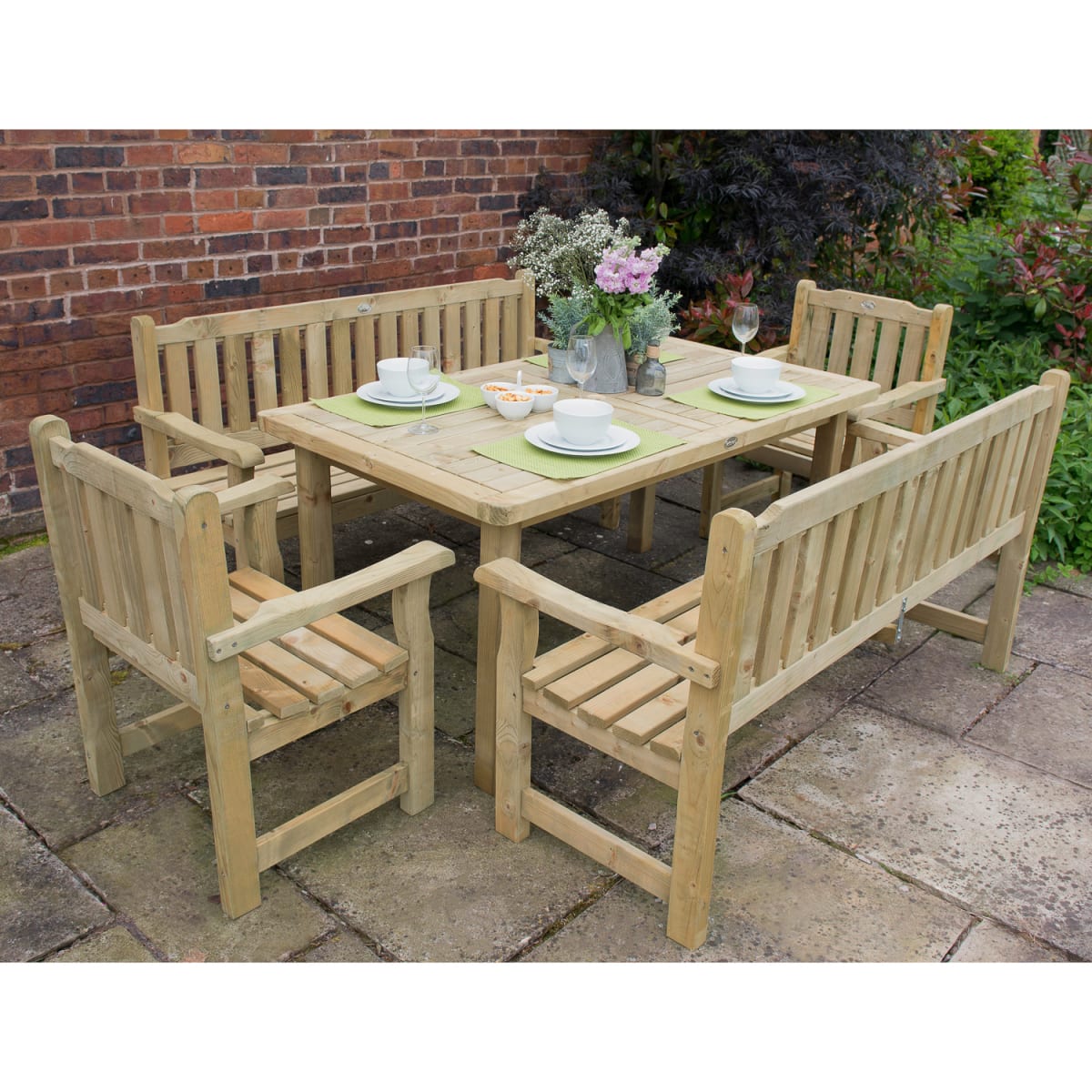 The Rosedene 5ft Bench from Forest has a classic design that will look at home in any garden setting. This sturdy bench has been made for comfort and features smooth-planed timber for a splinter free finish and high arm rests. Pair it with the Rosedene Table and Chairs to create a fantastic seating or outdoor dining area. Create a space that friends and family can enjoy for years to come.The Rosedene Range has all been manufactured from Pressure Treated timber to give a 15 year guarantee against rot. Delivered flat packed for easy self-assembly, fixings and instructions included.