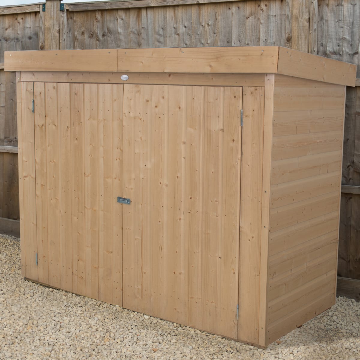 If you are looking for a stylish alternative to a shed, the Shiplap Large Outdoor Store from Forest Garden is a practical and great looking solution. With a generous 2000 capacity it is ideal for storing larger garden equipment, furniture and barbeques. Large double doors also mean it is perfect for use as a mower store or bike store.This robust, high quality outdoor store is manufactured using smooth-planed, pressure treated, shiplap tongue & groove boards and will look good in any garden or outdoor space. This subtle yet practical unit is also mounted on pressure treated bearers to prevent damage from standing water. The pressure treated store has a 15 year guarantee against fungal decay. Additional smooth-planed decorative barge boards all-round give an attractive finish.The doors can be closed using turn buttons provided and locked secure with the use of a padlock on the plate hasp and staple latch. The clever design also means the high quality, green mineral felted Pent roof can be assembled sloping back or forward depending on preference.Also available with Apex roof.