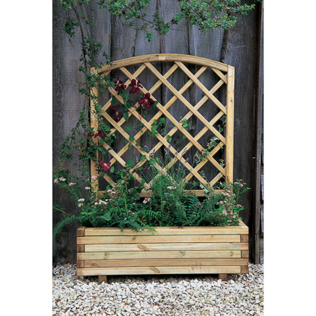 Combine practicality with style with the Toulouse Planter from Forest. This planter has a beautiful integrated dome top diamond trellis that is not only aesthetically pleasing but will support the growth of climbing plants.All timber used to manufacture this product has been Pressure Treated to give it a guarantee against rot and fungal decay for 15 years. The trough can hold approximately 89L of compost, so there is plenty of room for plants, flowers or even vegetables.Delivered to you flat packed with easy to follow step-by-step instructions and all the fixings you need for a simple build. If using to grow food produce we recommend lining the bed/planter with a membrane before adding the soil.