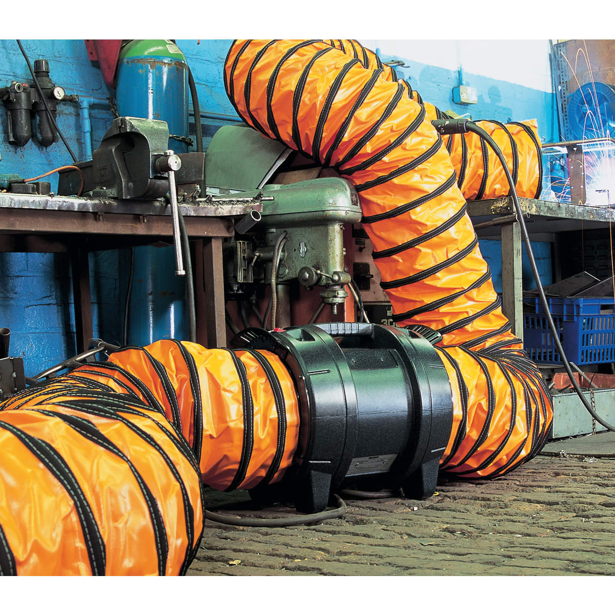 For cooling, ventilation and fume extraction. Suitable for distance up to 15m. 5m of retractable 300mm (12”) ducting. Available at 240V or 110V.