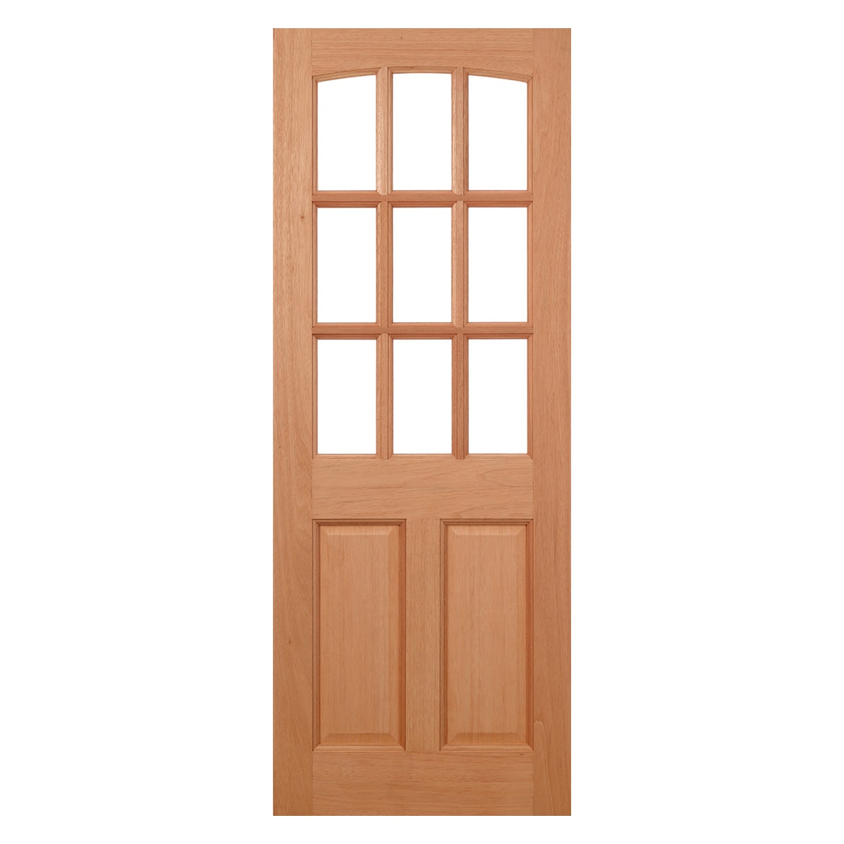 This Georgia door design features nine unglazed panels feature a subtle curved top edge, with two raised shaped panels in hardwood below.