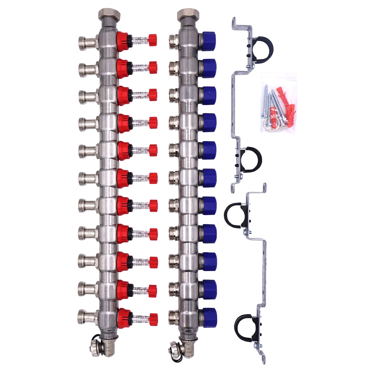 The Grant manifold is made from a high quality stainless steel and is for the distribution of hot water in radiant heating systems. The pipe loops are secured to these manifolds by the compression adapters (supplied separately). Manifolds are supplied in pairs, i.e. a flow and return manifold, together with fixing brackets.