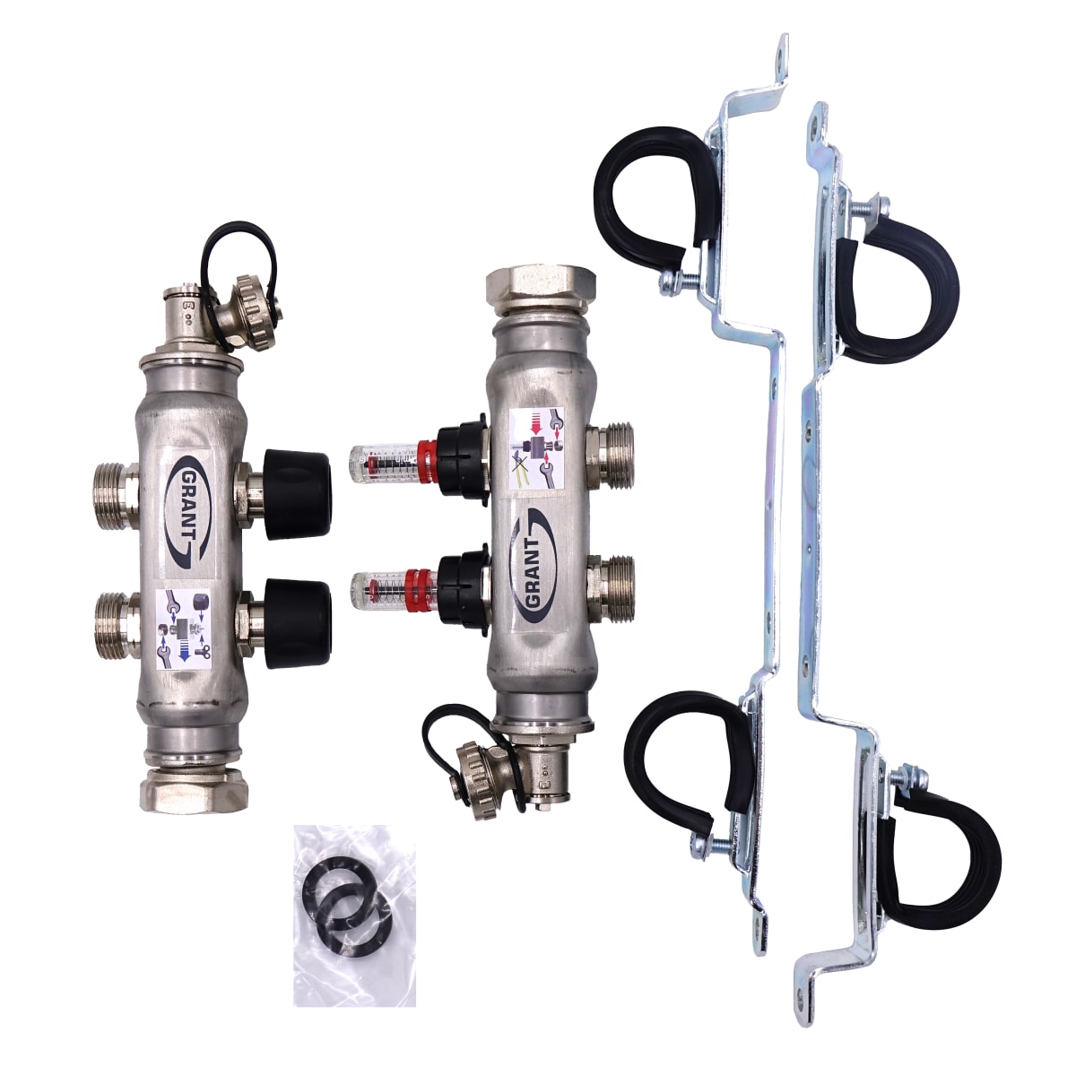 The Grant manifold is made from a high quality stainless steel and is for the distribution of hot water in radiant heating systems. The pipe loops are secured to these manifolds by the compression adapters (supplied separately). Manifolds are supplied in pairs, i.e. a flow and return manifold, together with fixing brackets.