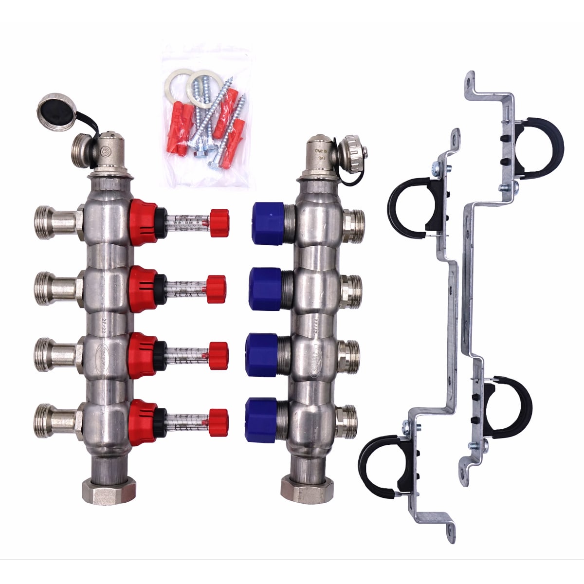 The Grant manifold is made from a high quality stainless steel and is for the distribution of hot water in radiant heating systems. The pipe loops are secured to these manifolds by the compression adapters (supplied separately). Manifolds are supplied in pairs, i.e. a flow and return manifold, together with fixing brackets.