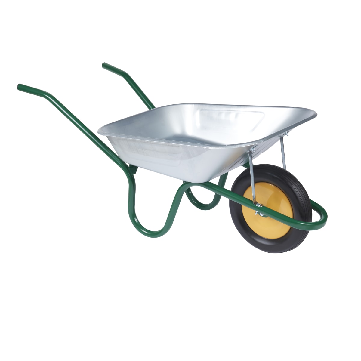A heavy duty wheelbarrow with a 90 litre galvanised steel tray. Fitted with an epoxy coated tubular steel frame with a solid front tipping bar for easier unloading. The puncture free wheel is attached to a heavy duty hub delivering the low maintenance of a solid wheel whilst providing easy manoeuvrability across all terrains even when the wheelbarrow is fully loaded. Engineered for professional use, making it ideal for all building trades and landscape gardeners.