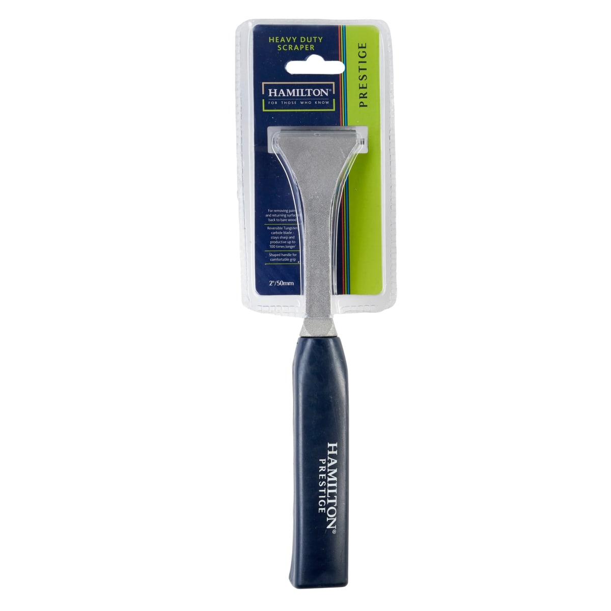 Hamilton Prestige Heavy Duty Scraper 2" W is manufactured from carbide used to remove paint and uneven surfaces on wood. The product is featured with a reversible tungsten carbide blade along with a wooden handle making it easier for the user to hold. The sharp blade lasts longer, staying productive up to 100 times. The product is user friendly and can be easily replaced as per the user need.