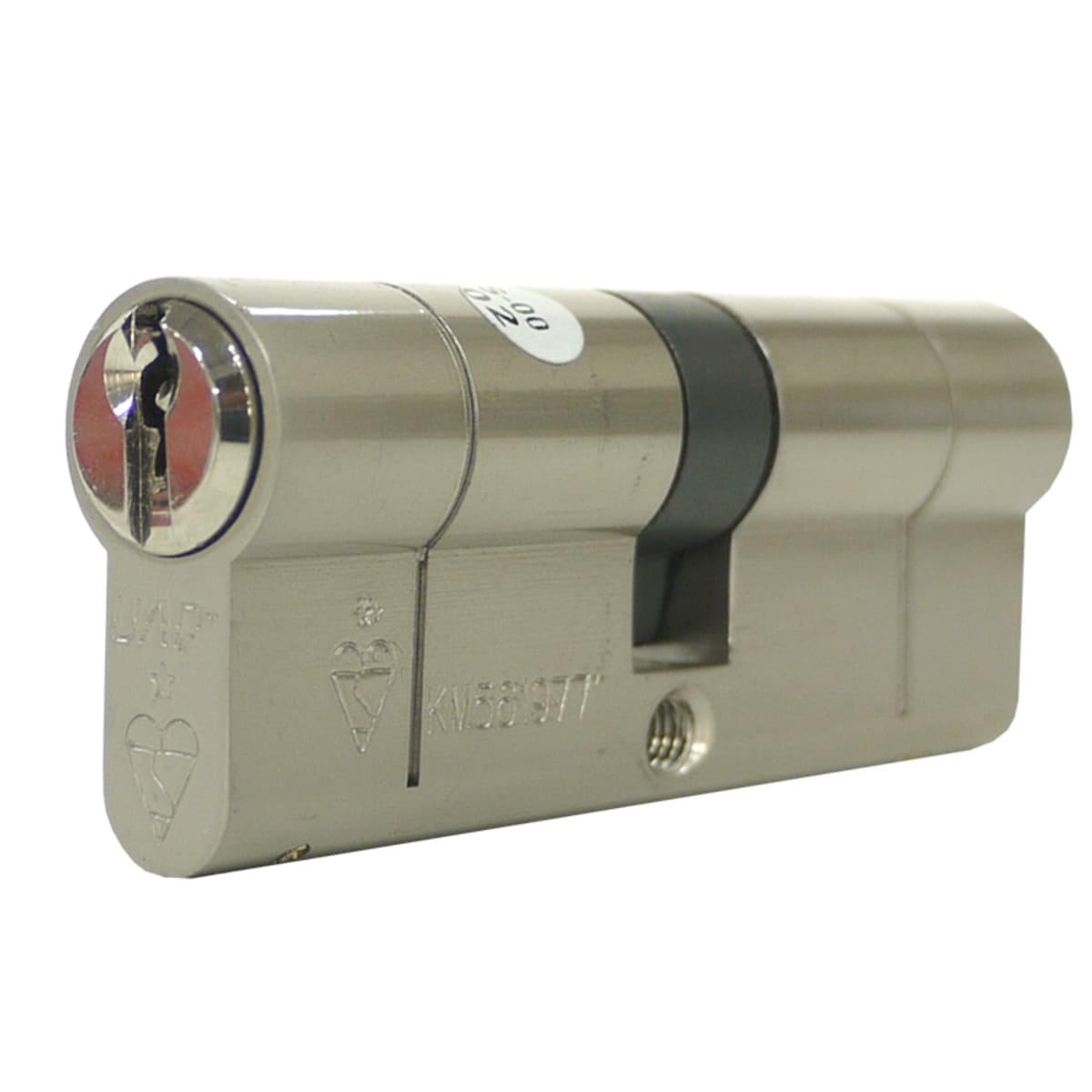 UAP+ Double 1 Star Kitemarked Euro Cylinder in a nickel finish. High-security 6 pin cylinder. Meets Police Preferred Specification and is accredited by Secured by Design. Sacrificial cut, anti-drill, anti-pick and anti-bump. Supplied with 3 keys.
