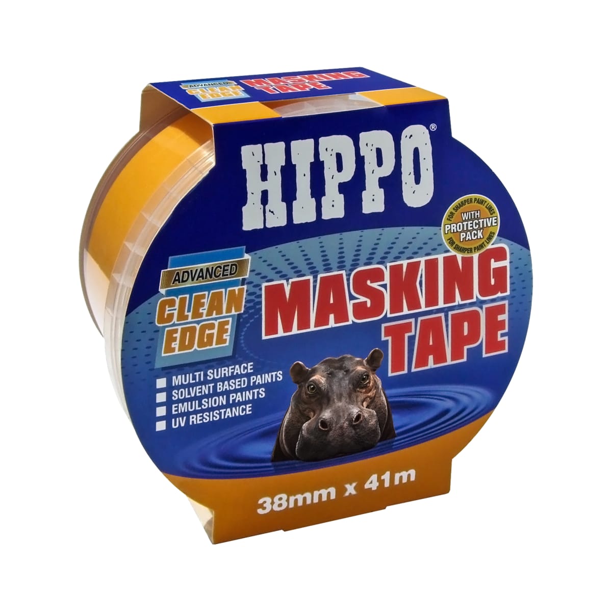 The Hippo Clean-Edge Masking Tape 38mm x 41m. A unique high quality thin paper masking tape that delivers a professional sharp, fine edge first time, every time. Suitable for use with both solvent and water based paints the UV resistant coating means it can be used inside or outside. Includes a handy plastic storage container to protect tape edges for future use.
