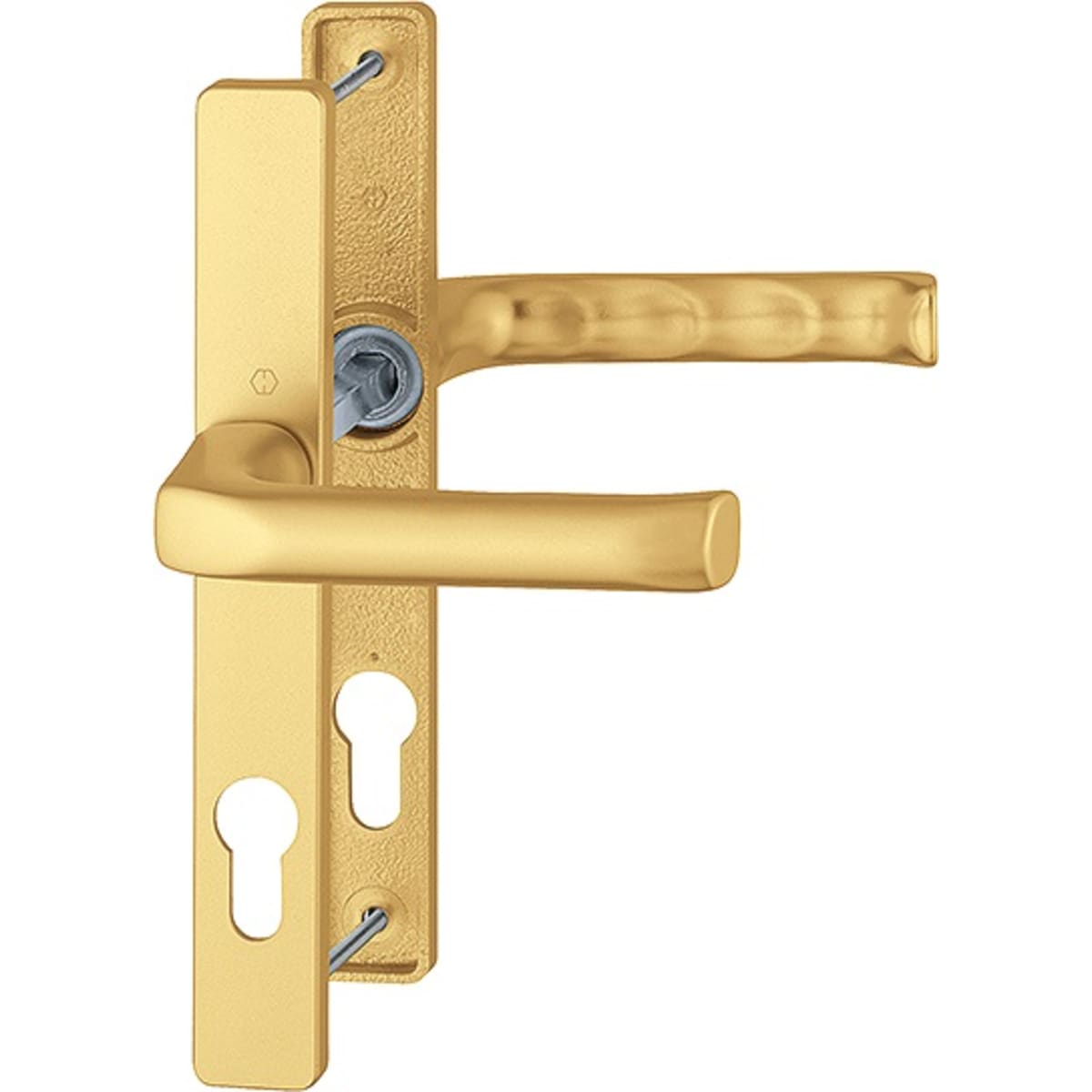 Hoppe Duraplus London Handle with 205mm Backplate Anodised Gold, is manufactured from aluminium ensures the durability of the product. The backplate measures 27 x 8mm (W x T), with lever measuring 120 x 53mm (L x D). The spindle size is 7mm with a euro profile cylinder type of keyhole.