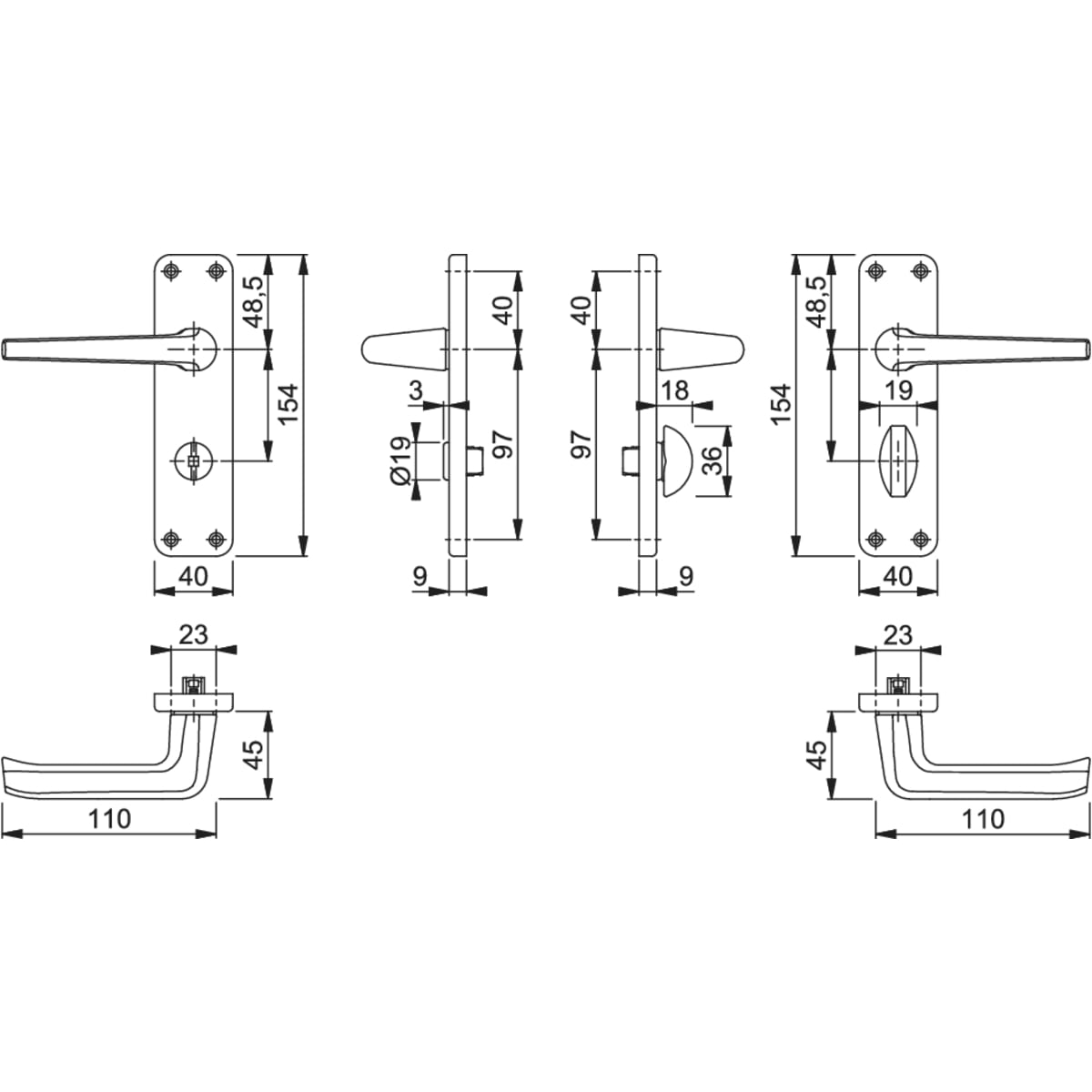 Hoppe Sprung Bathroom Lever is supplied with 154 x 9mm (L x T) solid spindle. Finished with satin anodised aluminium, to provide strength and hardness to the product increasing its durability. This sprung bathroom lever is suitable for 20 to 40mm door thickness. It consists of a straight lever on a rectangular backplate with black end inserts top and bottom.