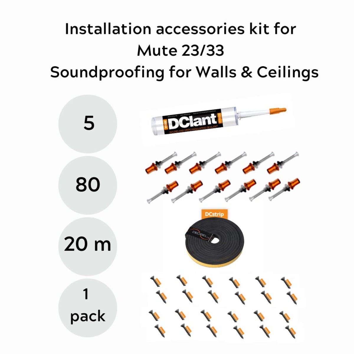 Mute 23/33 installation kit - Enough for 12 square meters (10 Mute boards). Kit includes all the essential components to install Decibel's Mute23 / Mute33 / CMute23 / CMute33 Soundproofing boards. Kit includes: 80 off Dclox long anti-vibration mounts and Fischer screws/wall plugs, 5 tubes of Dclant acoustic mastic, 1 x 20m strip of DCStrip anti-flanking strip, 1 pack of DC Screw 19
