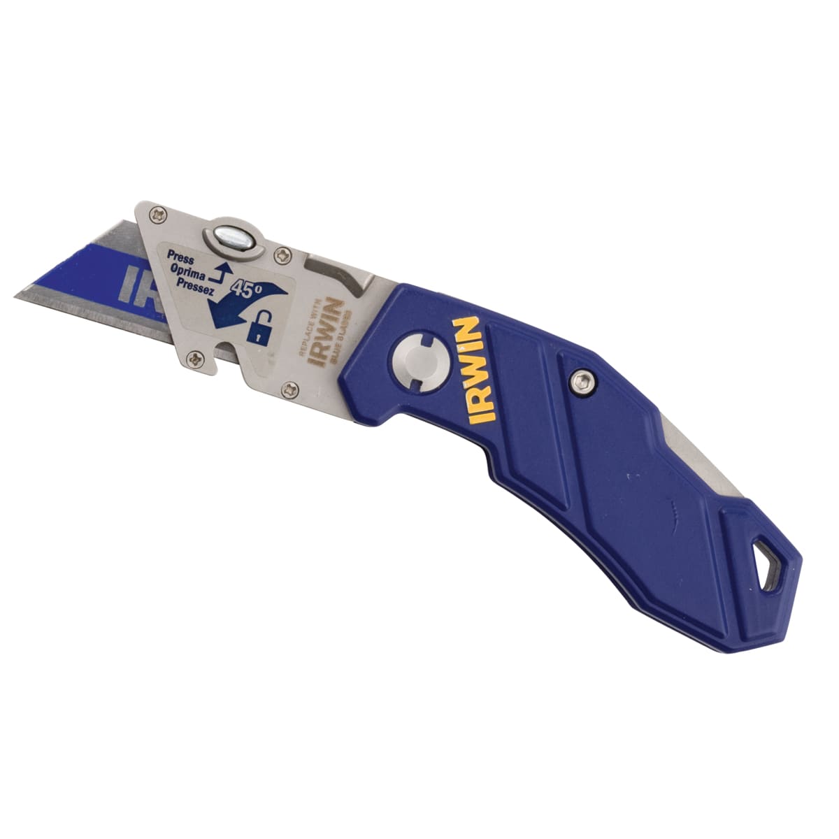 IRWIN Folding Trapezoid Knife is a compact blade for standard cutter knives. Comes with 45 degrees angle for quick change and safety lock to prevent any accidental release. Extended stainless steel thumb ledge for better hold during cutting.