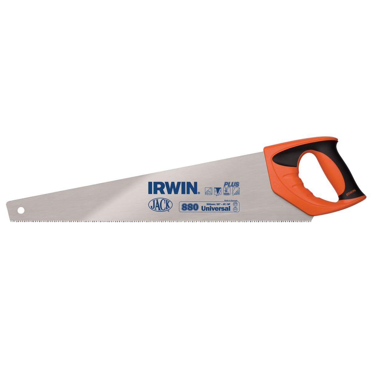 The Irwin Jack Universal 880 Triple Ground Hardpoint Handsaw 550mm (22in) is designed with a high quality C75 steel blade. It features a unique triple ground tooth design offering up to 25% faster cutting performance than traditional double ground saws. The blade has a PTFE coating to reduce friction. The handle is light and strong with an ultra-sonic welded soft-grip for increased hold and enhanced comfort. The 90 and 45° angles integrated with the handle provide help when marking out.