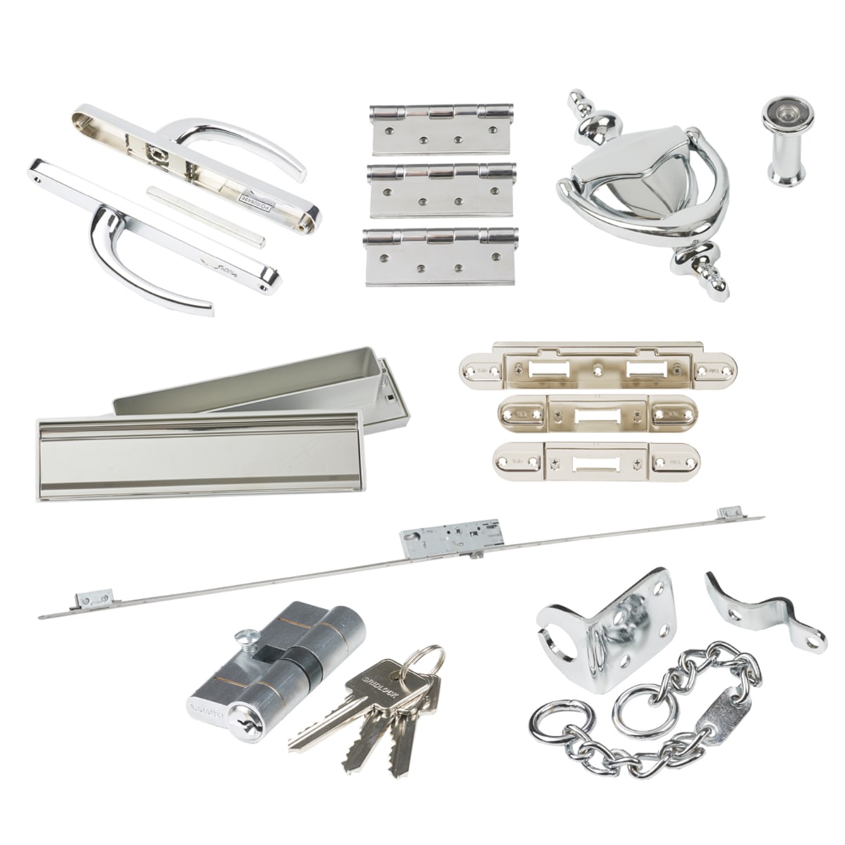 The premier front door set includes everything you need for a sleek looking new front door featuring a Venice polished stainless steel euro lock feature, a sleeved letter plate with silver surround, a 180 degree polished chrome door viewer, a PCP urn door knocker and a polished chrome narrow door chain.