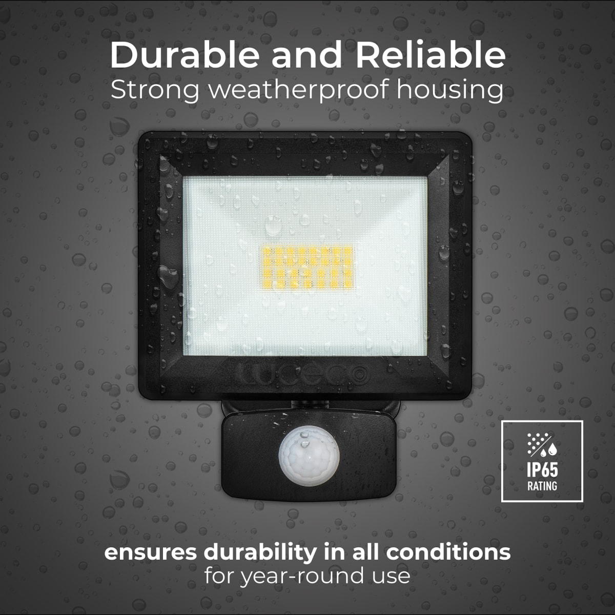 Secure outdoor spaces with the Luceco 20W Essence LED IP65 floodlight. Delivering 2100lm of 4000K light, it features a PIR motion sensor with 8m range and 180° detection angle, 10s-8min time delay, and Dusk-to-Dawn override. Easy to install with a slide-on bracket, 1.5m prewired cable, and adjustable Fit&Tilt ball joint. Ideal for driveways, gardens and pathways.