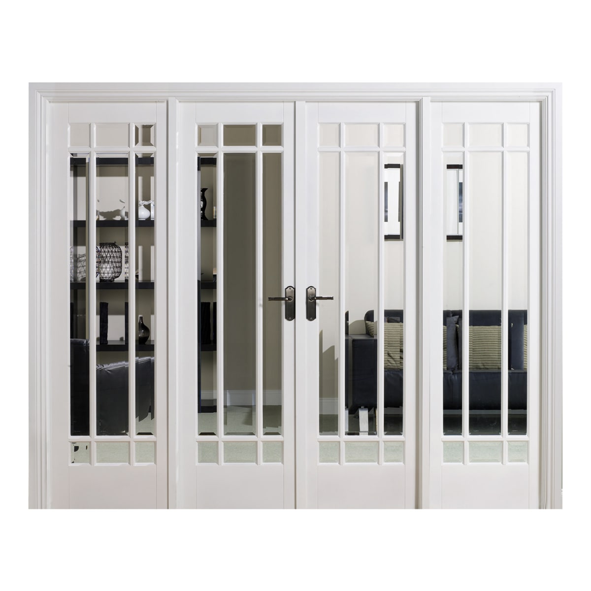 Ideal for dining rooms or lounges, this Shaker style door features clear bevelled glazed panels with decorative bars in a white primed solid core.