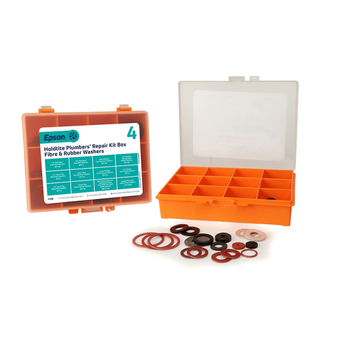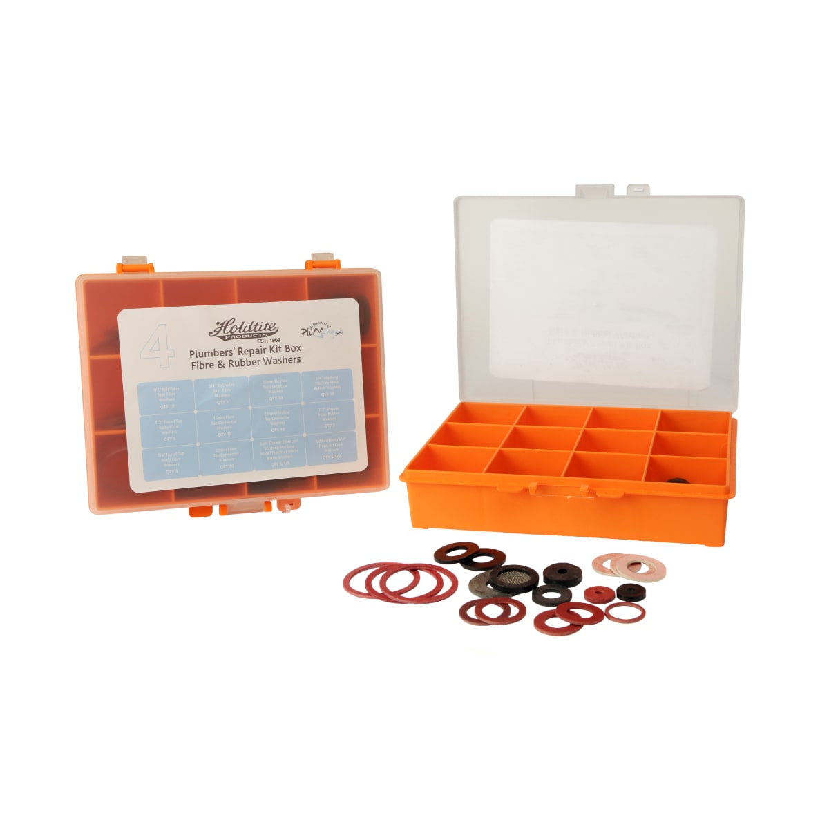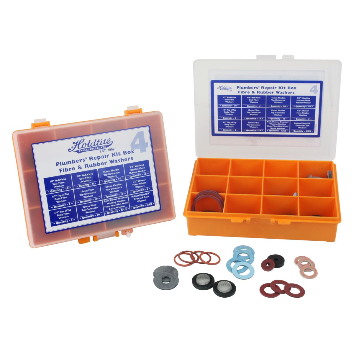 Masefield Holdtite Fibre and Rubber Plumbers Rubber Kit Box available in orange colour consists of fibre, rubber and connector washers. The box contains 0.5in ball valve seat fibre washers, 0.75in ball valve seat fibre washers, 15mm flexible tap connector washers, 0.75in washing machine hose rubber washers, 0.5in top of tap body fibre washers, 15mm fibre tap connector washers, 22mm flexible tap connector washers, 0.75in top of tap body fibre washers, 22mm fibre tap connector washers, bath shower diverter, washing machine hose, filter, hot water bottle washers and draw off tap washers. A rubber washer is a ring made of rubber used in mechanical devices. It is used to prevent vibration from spreading from one part to another, reducing the noise levels.