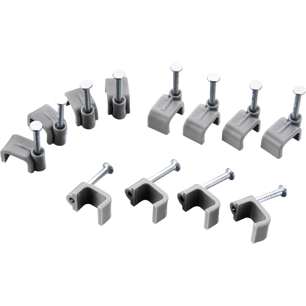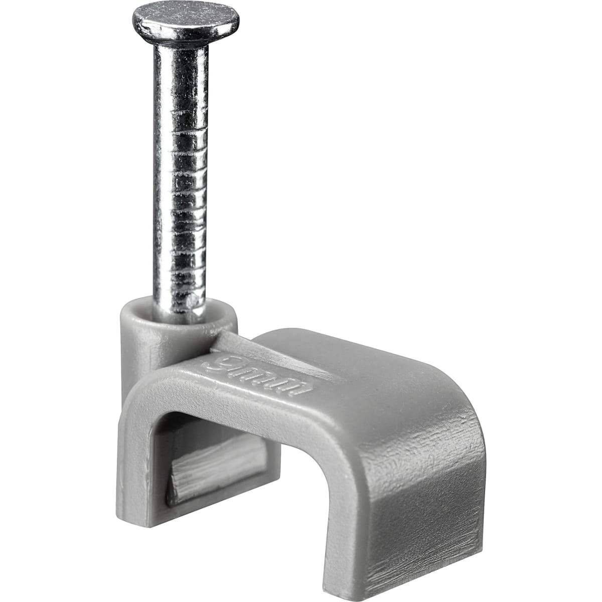 For fast installations of cables. Suitable for use wood, masonry and compressed board. Grey Colour. Manufactured from strong, impact resistant polypropylene. Each clip includes integrated zinc coated nail.