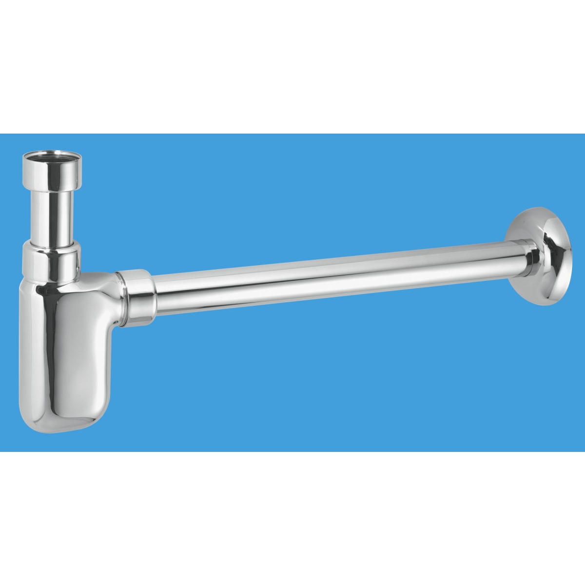 This McAlpine 75mm Water Seal Chrome Plated Brass Adjustable Inlet Bottle Trap with a 16" length of 32mm Outside Diameter Chrome Plated Brass Waste Pipe and Matching Wall Flange. Supplied with MS4-32SOLVENT Fitting to convert to 1¼" UK pipe size.