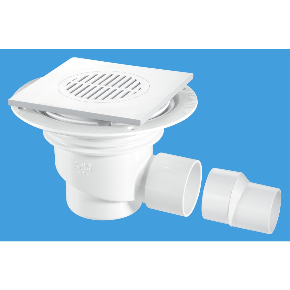 McAlpine Trapped gully with 150mm square white ABS tile. McAlpine Gullies are ideal for domestic wet rooms, lifetime Homes, disabled adaptations, student accommodation, bathroom pods, hotels, hospitals and sport and leisure facilities.