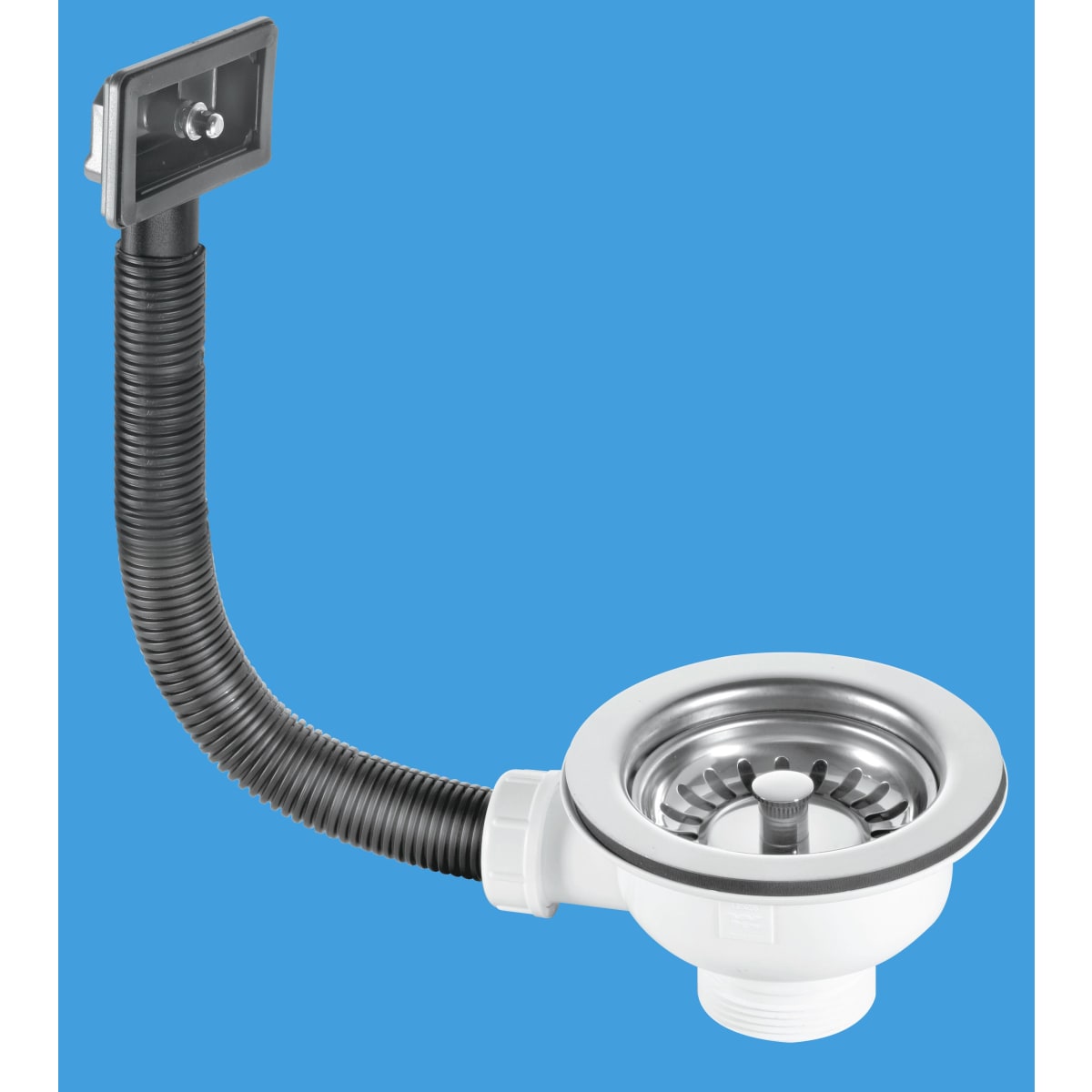 This McAlpine 1½" Basket Strainer Waste with Rectangular Overflow waste is supplied with 113mm Stainless Steel Flange and a Stemball Plug and 41mm fixing ferrule. The Flexible overflow tube has an Outer Diameter of 25mm. The centre pin dry fixing connection has the advantage of a quick, simple and neat installation affording a saving in material and labour costs. The polished stainless steel flange eliminates the problem of chrome plating deterioration.