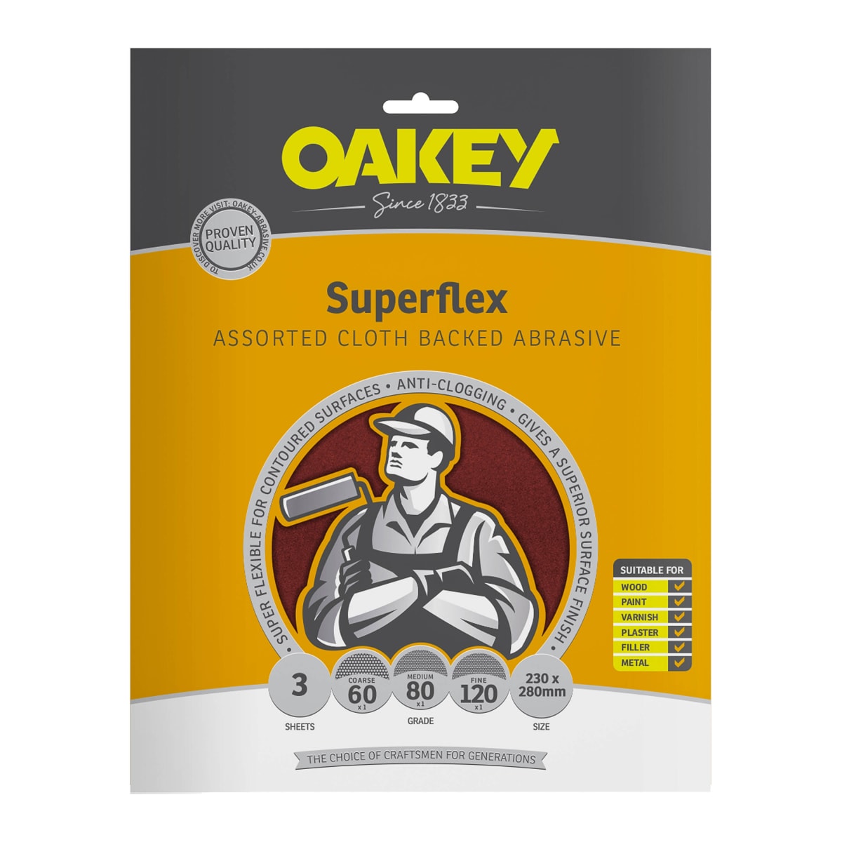 Oakey SuperFlex Cloth Backed Aluminium Sheet measures 280 x 230mm (L x W) - Pack of 3. It is used for sanding on extremely hard surfaces. It is ideal for wood, paint, varnish, plaster, filler and metal. The cloth-backed sheets are manufactured from aluminium oxide. The pack consists of 1 x coarse, 1 x medium and 1 x fine sheets.