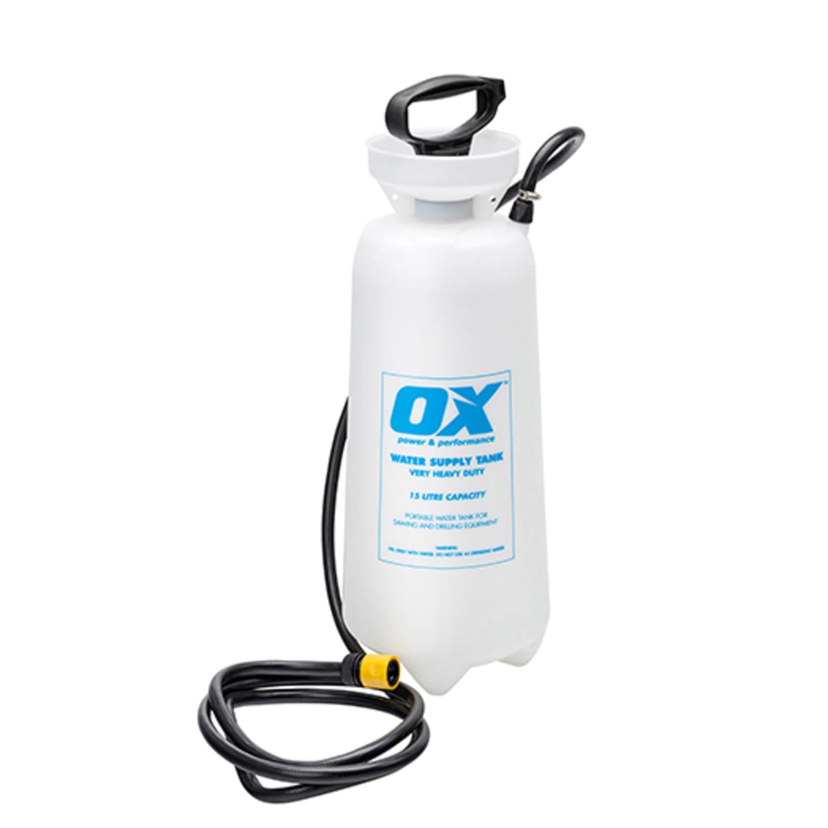 The OX 15 Litre Heavy Duty Water bottle is a tough water supply tank for sawing and drilling equipment wih a heavy-duty carry handle with a robust polythene casing. A 4M transparent hose provides extra working length and comes with a protected hose connection to prevent damage and breakage during use. Its strong and stable base protects the bottom of the bottle and gives extra stability when using this.